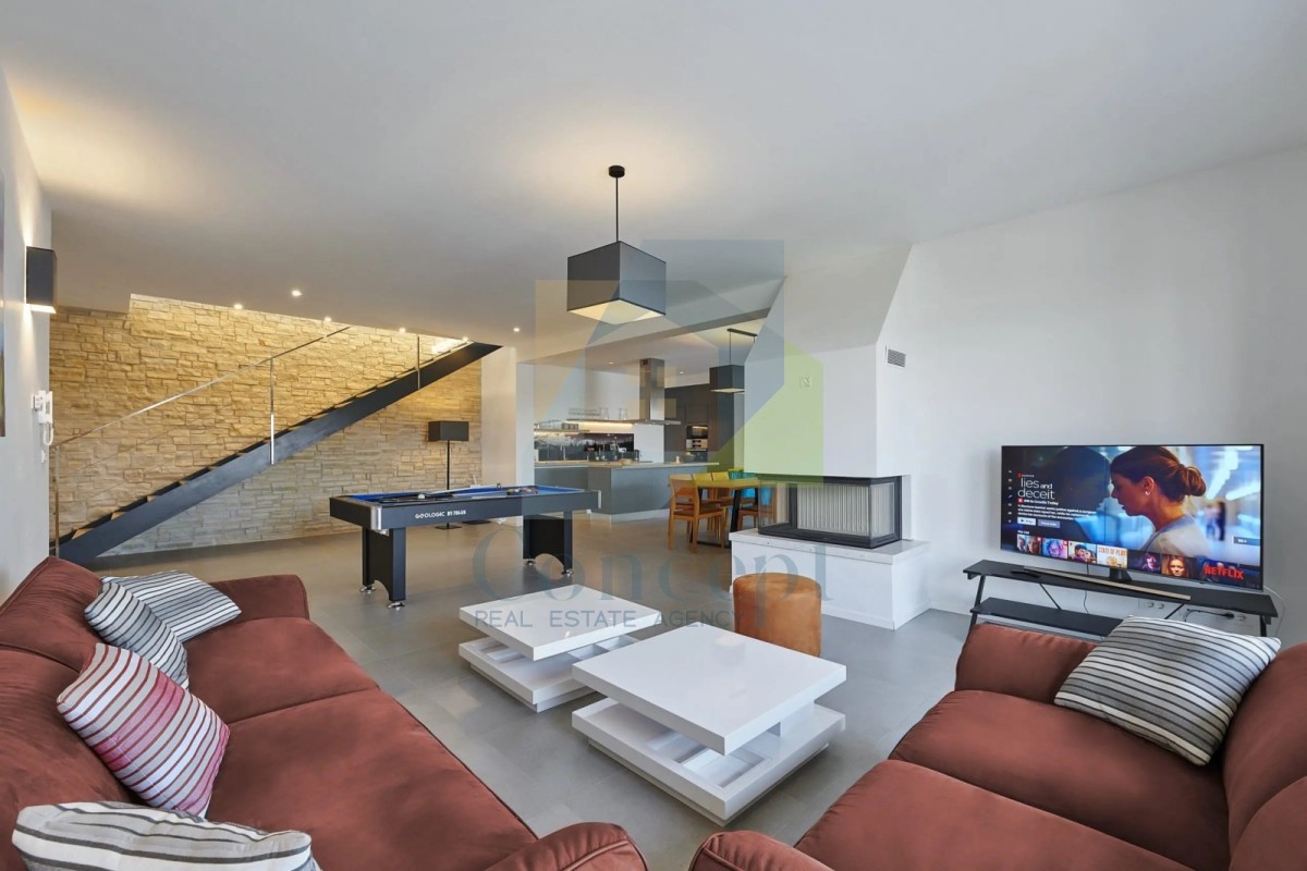 Prostire se na dvije etaže i sastoji se od četiri spavaće sobe, svaka s vlastitom kupaonicom, dodatnog toaleta u prizemlju, prostranog dnevnog boravka s kaminom, kuhinje s otokom te dodatne prostorije koja je trenutno uređena kao prostor za zabavu, a u nastavku koje je predviđena kupaonica povezana s tehničkom sobom, što omogućuje formiranje pete spavaće jedinice.