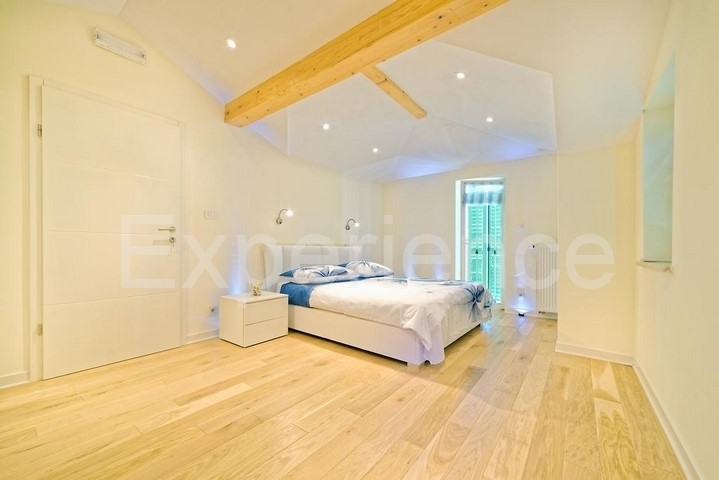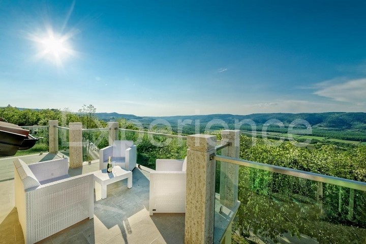 U okolici Motovuna – u iznimno mirnom ambijentu, na vrhu brdašca nalazi se prekrasna vila, površine 260 m2. Vila se sastoji od tri etaže: prizemlje, prvi kat i drugi kat. Vila je kompletno renovirana 2015. godine. U prizemlju smješten je dnevni boravak, kuhinja sa blagovaonicom i vinoteka. Na prvi kat kuće vode kamene stepenice, gdje su smještene dvije spavaće sobe svaka sa vlastitom kupaonicom. Spavaće sobe imaju izlaz na prostranu natkrivenu terasu (18 m2) sa koje se pruža prekrasan panoramski pogled na Motovun. Na drugom katu smještene su dvije spavaće sobe svaka sa vlastitom kupaonicom, te izlazom na prostranu terasu koja nudi fantastičan pogled na Motovun i panoramu.Vili pripada vrt površine 800 m2. U uređenom vrtu smješten je bazen (36 m2) i sauna.Grijanje: centralno grijanje na struju i solarne panele, te klima uređaji u svim prostorijama.U navedenoj cijeni uključeni su namještaj i tehnika.