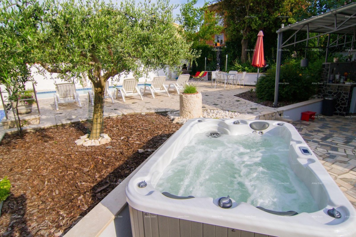 Uređeno dvorište površine 570 m² uključuje bazen, jacuzzi, sunčalište, roštilj i vrtnu garnituru, idealno za opuštanje i uživanje u toplim ljetnim mjesecima.