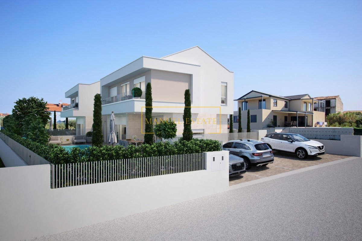 Okućnica vile pažljivo je uređena, s naglaskom na uživanje u vanjskom prostoru. Središnji dio zauzima bazen površine 30 m², okružen sunčalištem i zonom za opuštanje. Ispred vile nalaze se dva parkirna mjesta, što dodatno doprinosi praktičnosti.