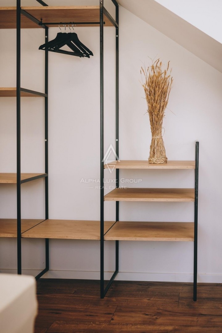 U prizemlju otvoreni prostor objedinjuje dnevni boravak, blagovaonicu i kuhinju s izlazom na natkriveni trijem s pergolama, dvije spavaće sobe, kupaonicu i gostinjski wc. Potkrovlje se sastoji od ulaznog hodnika, spavaće sobe, kupaonice i terase.