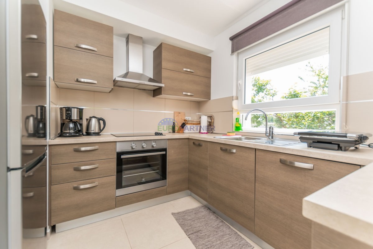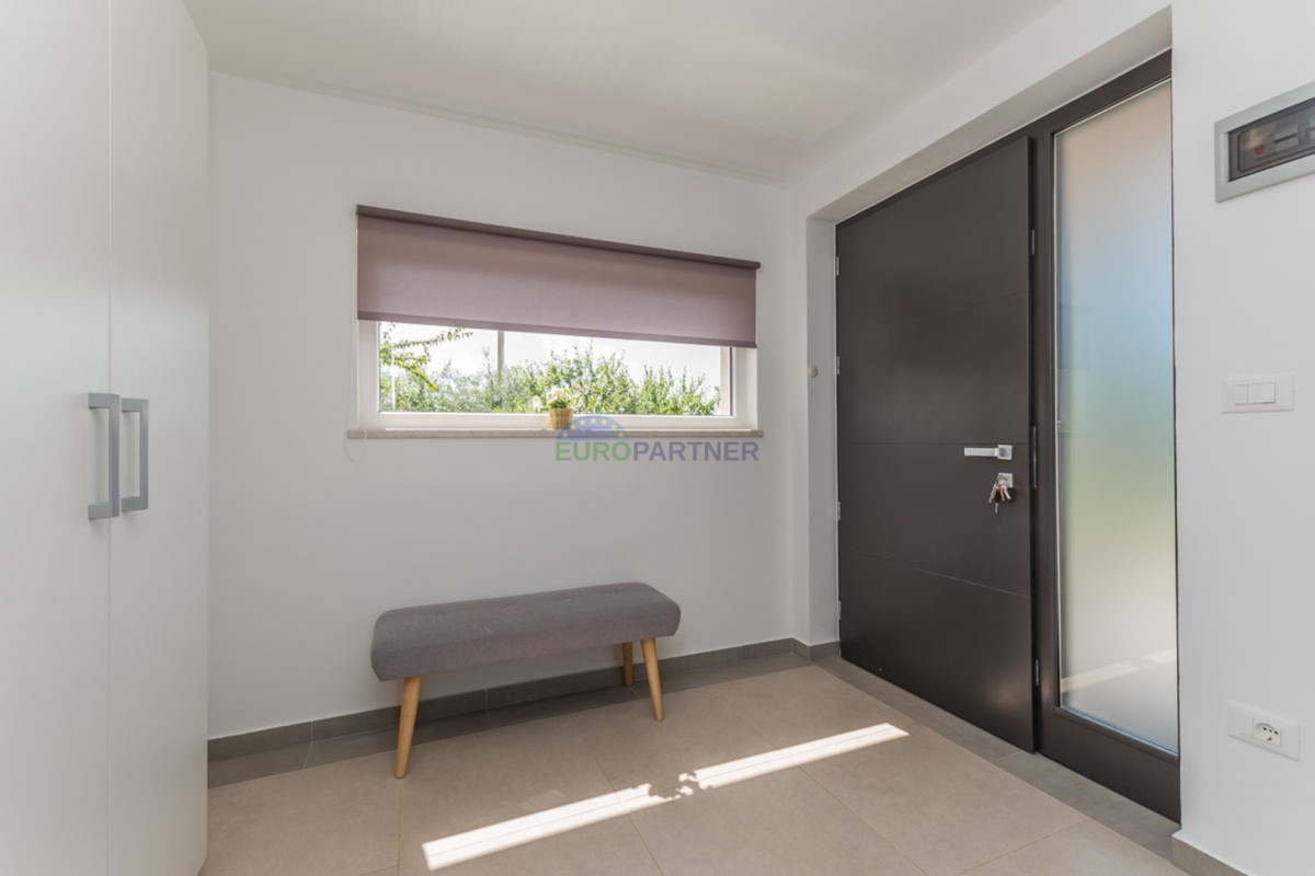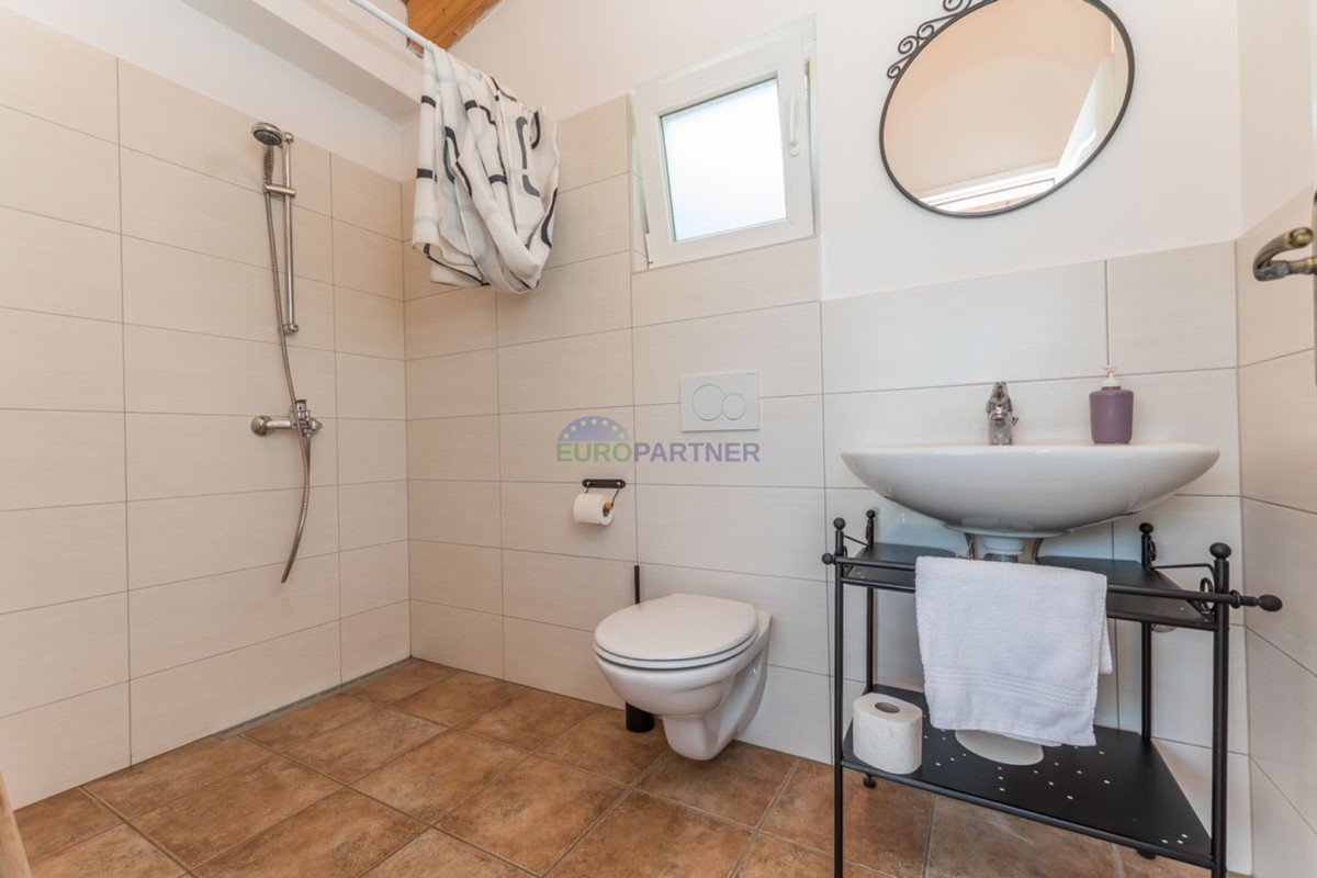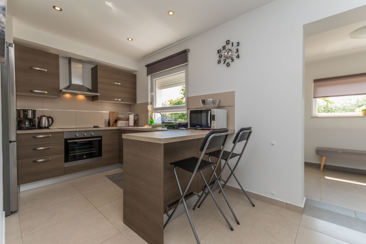 Ova kuća raspolaže s tri spavaće sobe, prostranim dnevnim boravkom i modernom kuhinjom opremljenom svim potrebnim aparatima. Udoban interijer dodatno naglašava centralno grijanje i klima uređaj, osiguravajući ugodan boravak tijekom cijele godine.