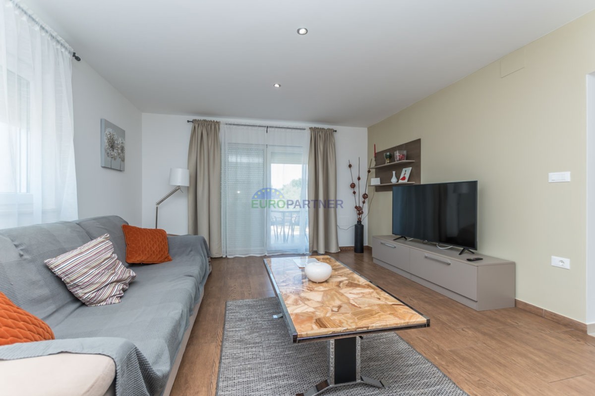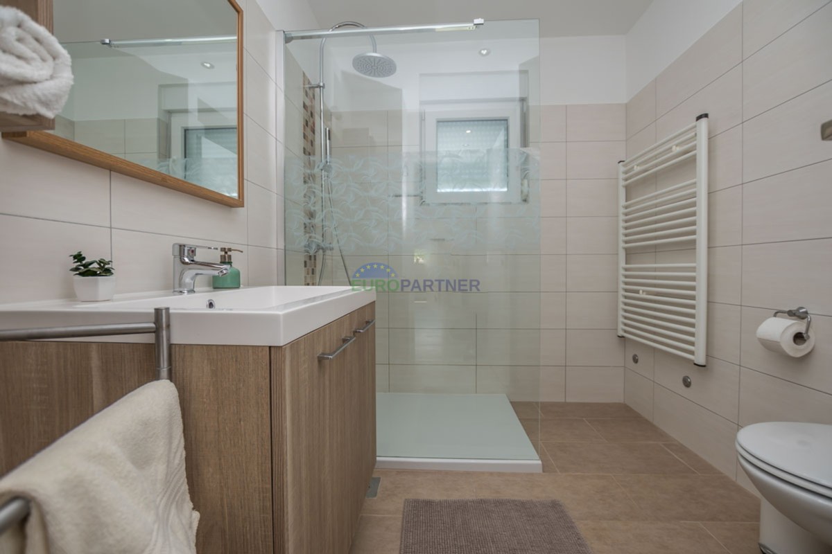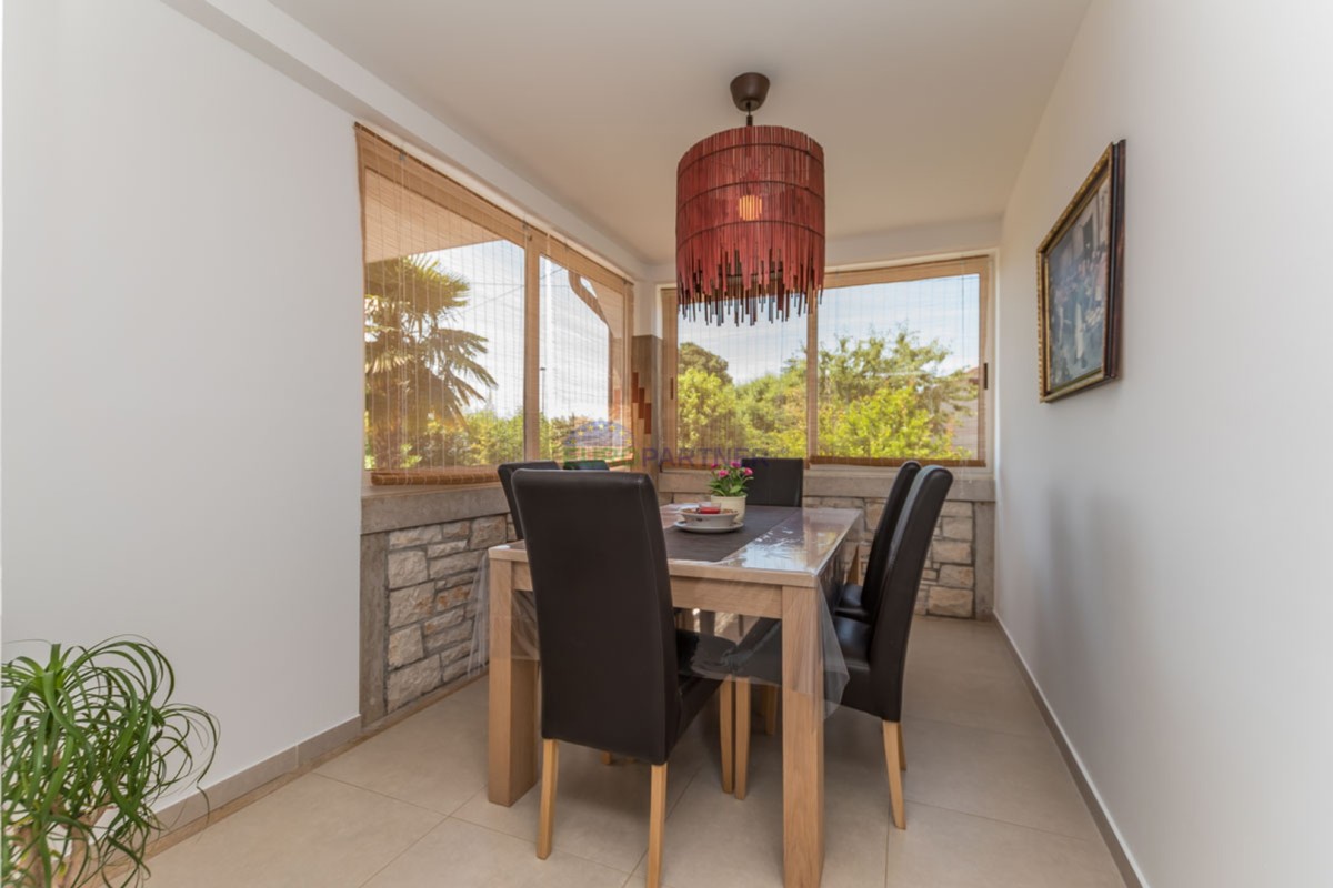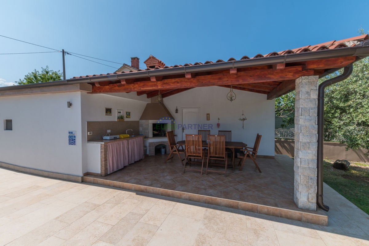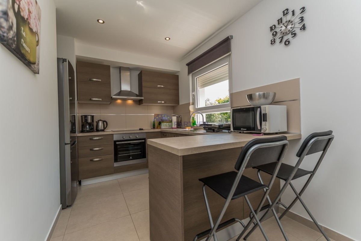 Ova kuća raspolaže s tri spavaće sobe, prostranim dnevnim boravkom i modernom kuhinjom opremljenom svim potrebnim aparatima. Udoban interijer dodatno naglašava centralno grijanje i klima uređaj, osiguravajući ugodan boravak tijekom cijele godine.