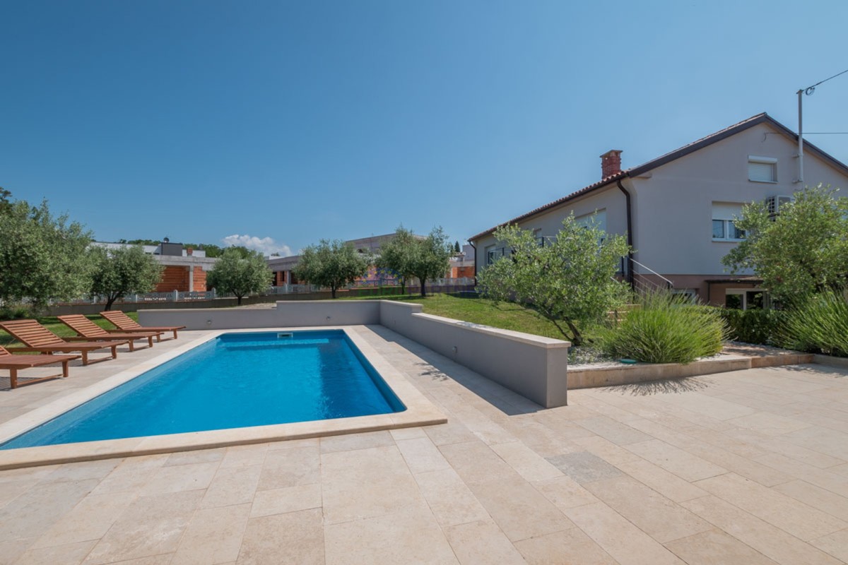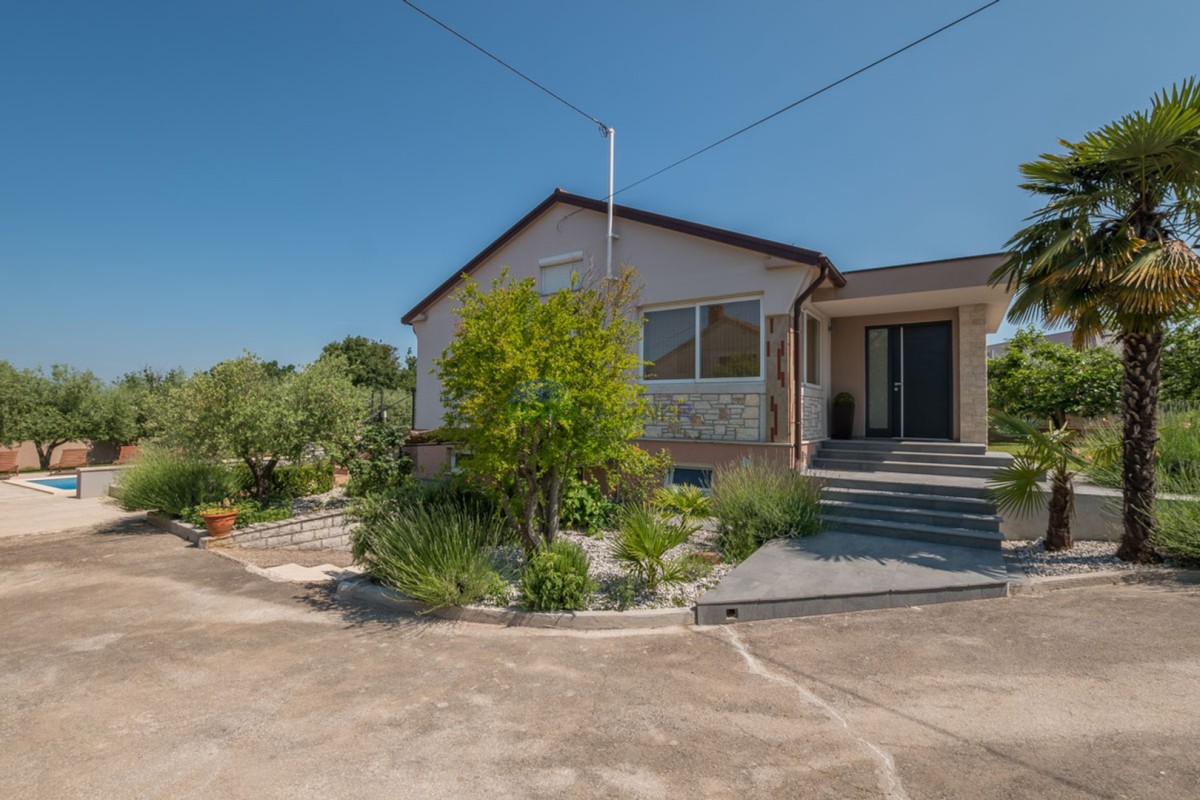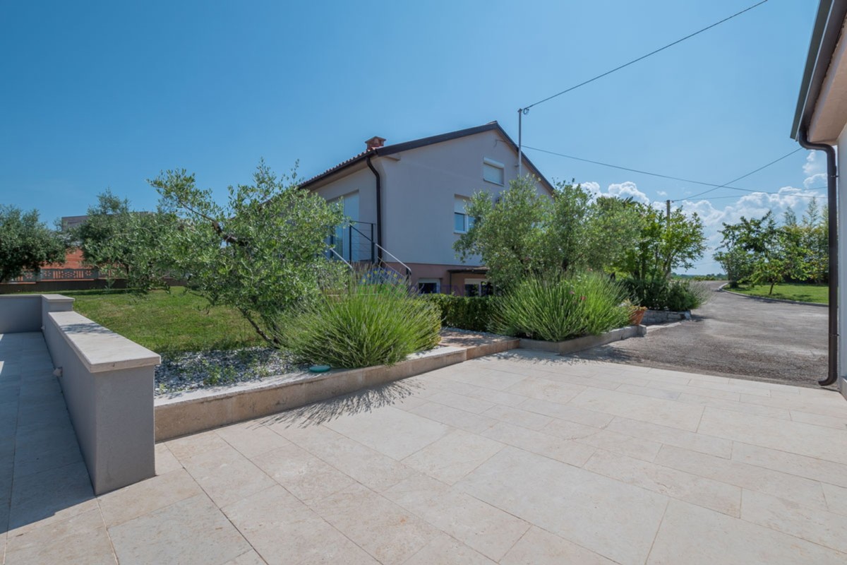 Vanjski dio nekretnine uključuje ugodnu lođu za hladnije dane, na izlazu prema bazenu jednu manju vanjsku terasu ,odmah pokraj bazena nailazimo na ljetnu kuhinju sa kaminom i prostorom sjedenje a sve to nalazi se na parceli od 1500 m2. Tu je i bazen koji pruža osvježenje tijekom ljetnih mjeseci. Kuća također ima garažu, dodatno parkiralište i dvorište.