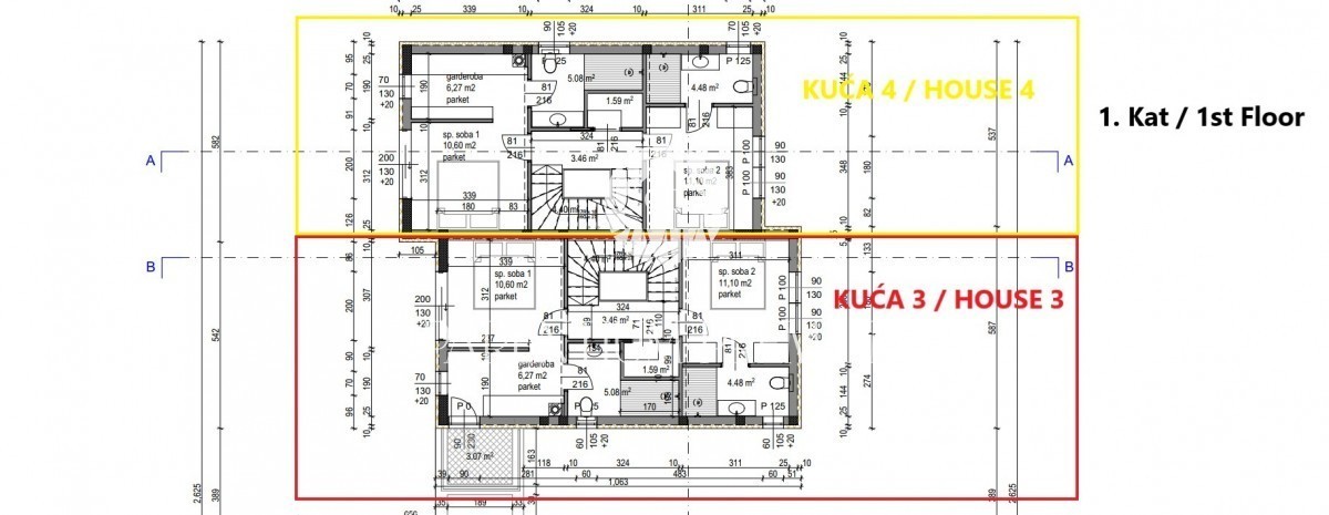 Na prvom katu se nalazi hodnik, dvije spavaće sobe, svaka sa svojom vlastitom kupaonicom, dok jedna spavaća ima garderobu/walk-in ormar.