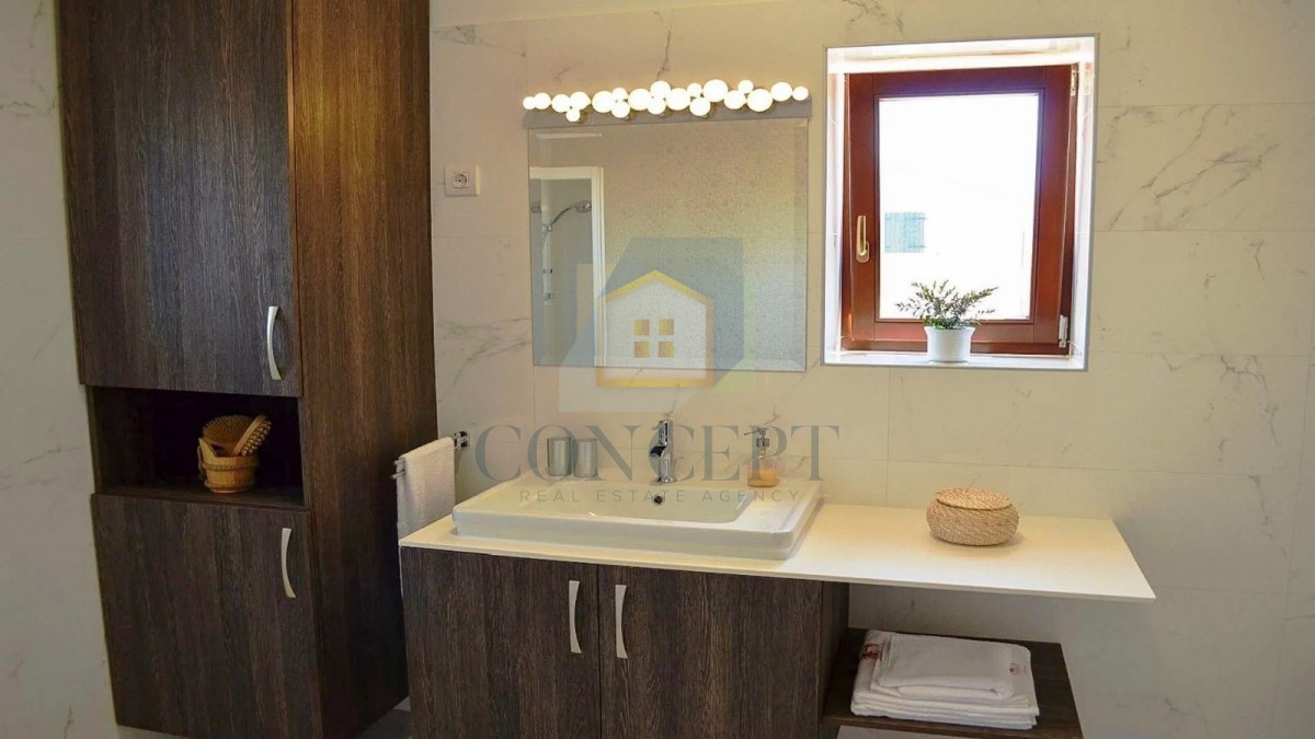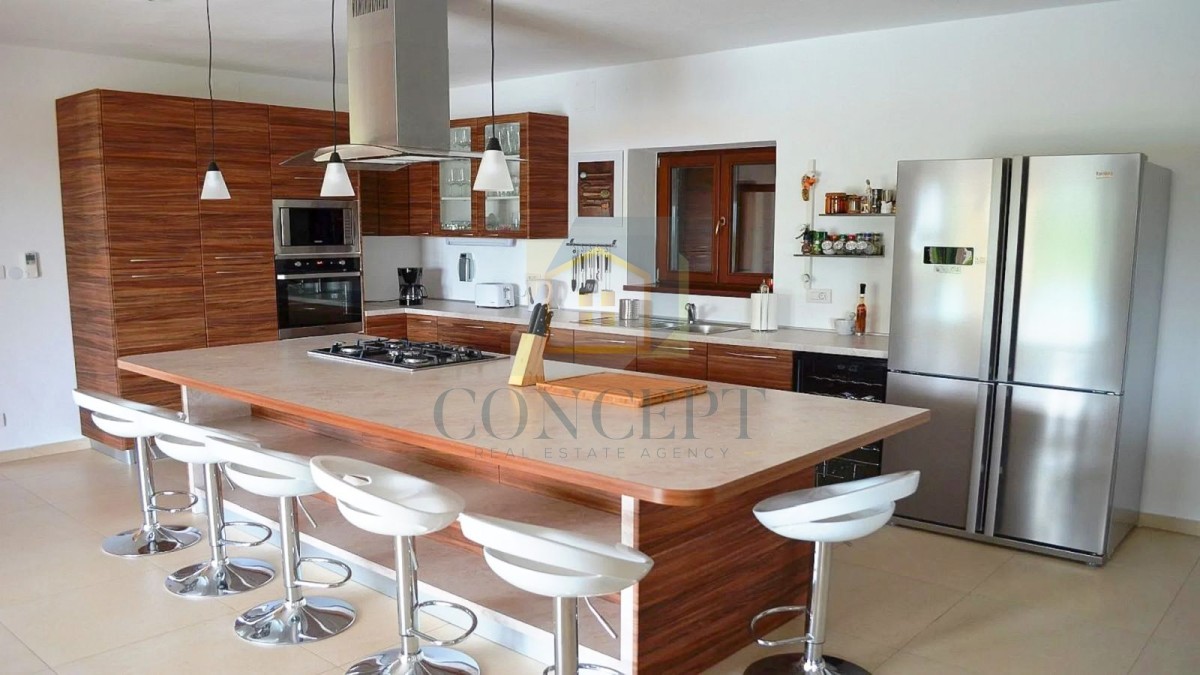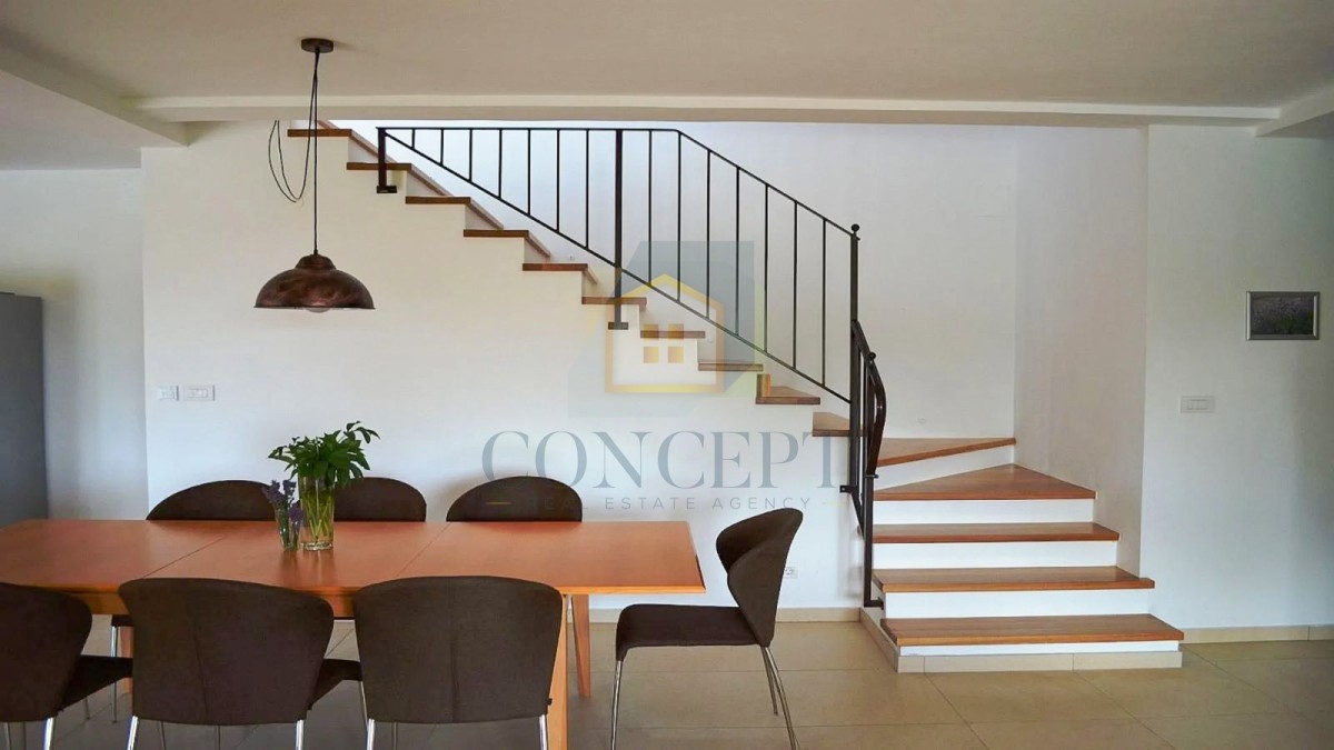Kuća je podijeljena na prizemlje i kat. U prizemlju se nalazi prostrani dnevni boravak, blagovaonica, kuhinja, gostinjski toalet, ostava, ljetna kuhinja, spavaća soba s vlastitom kupaonicom te velika terasa.