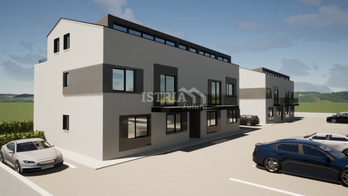 Na prodaju predivan novi stan površine 74,40 m2 smješten na 1. katu male, moderne zgrade sa samo 5 stanova koja se nalazi na 2,5 km od mora i 5 km od centra Poreča.