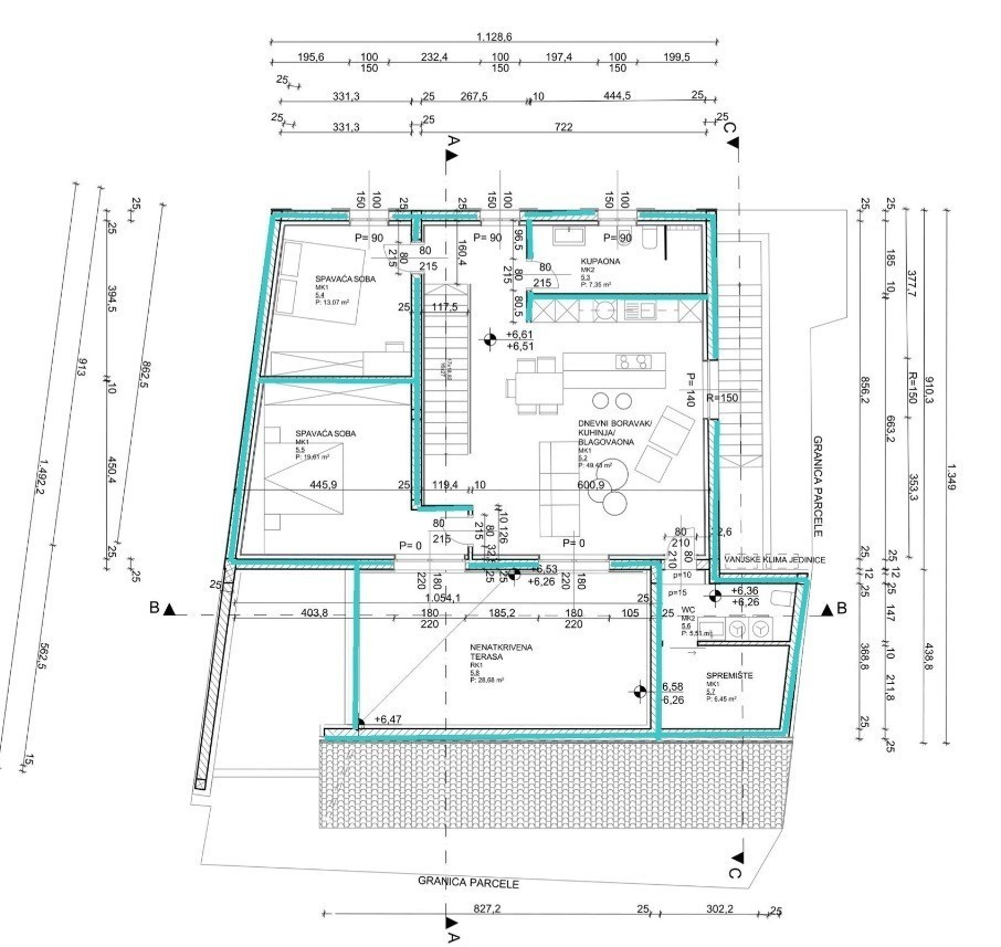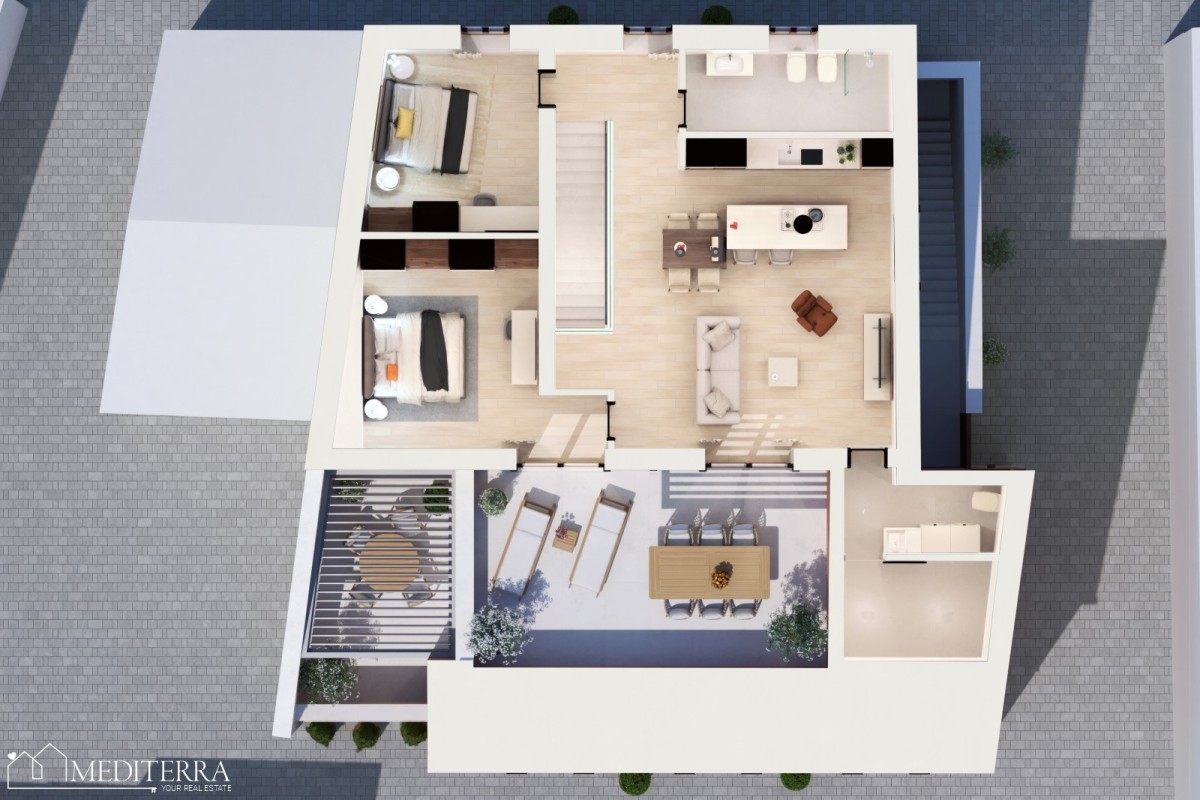 Sastoji se od ulaznog prostora, kupaonice, dvije spavaće sobe, WC-a, kuhinje, dnevnog boravka i terase.