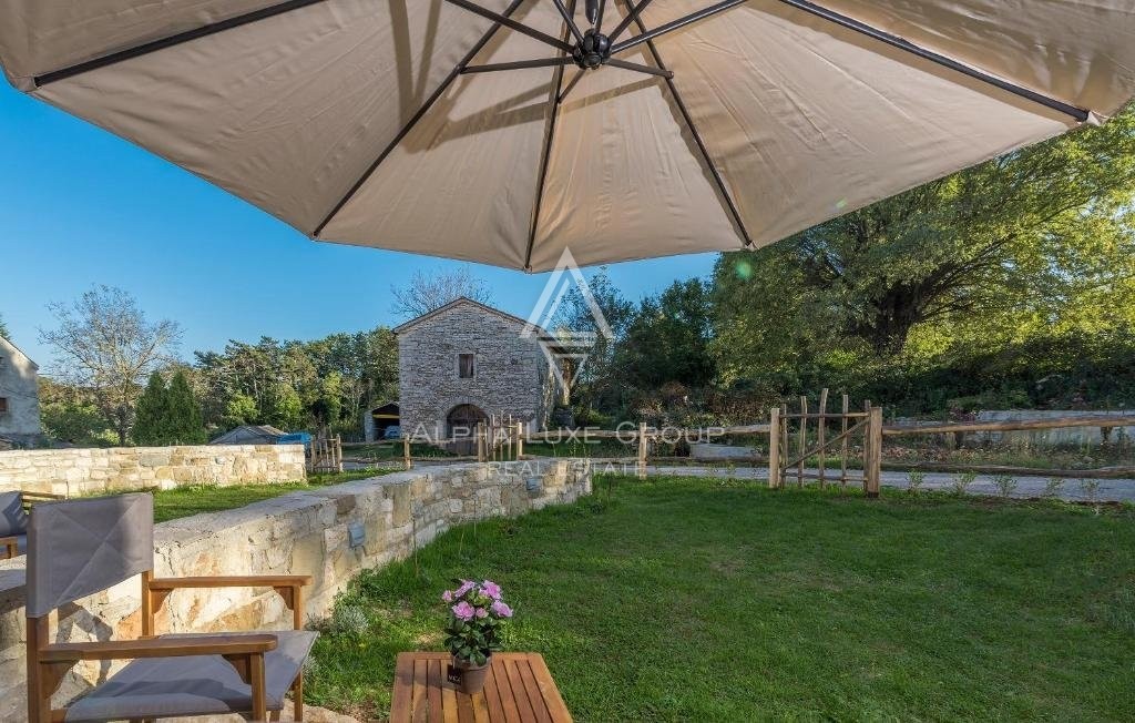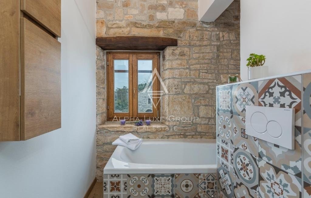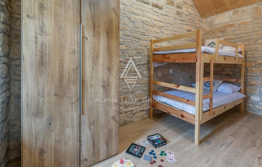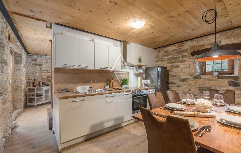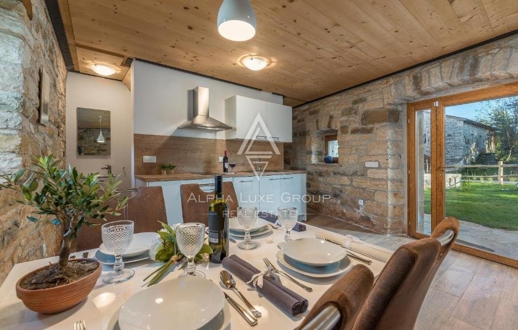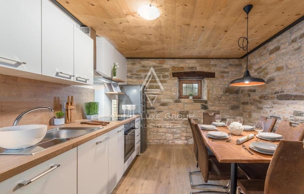 Riječ je o rijetkoj nekretnini na tržištu, izgrađenoj 1846. godine, a tijekom potpune obnove 2020. godine sačuvani su svi detalji autohtonog istarskog doma, što je i čar ove nekretnine. Prvi apartman ima površinu od 60,24 m2, uključuje kuhinju, blagovaonicu, wc i dnevni boravak, s izlazom na vrt od cca 30 m2. Unutarnjim stepenicama smo se popeli na kat sa dvije spavaće sobe i jednom kupaonicom.