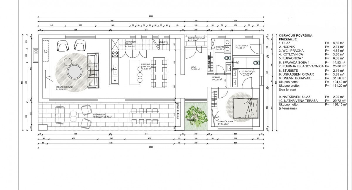 Prizemlje će se sastojati od ulaznog hodnika, dnevnog boravka sa kuhinjom i blagovaonicom, kotlovnica, praonica, spavaća soba sa privatnom kupaonom, dodatni wc za goste te natkrivena terasa od cca. 30 m2 na kojoj će se nalaziti ljetna kuhinja.