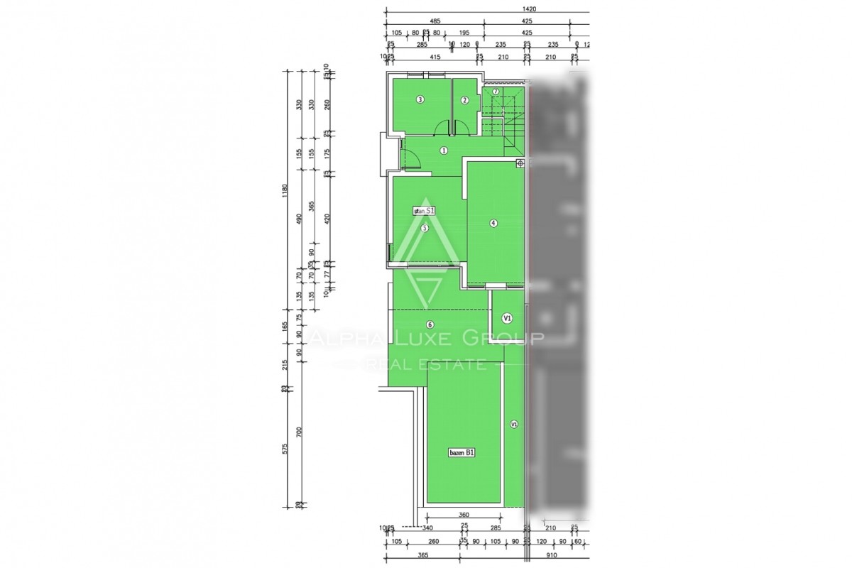 U vanjskoj zoni dominira skimerski bazen površine 25,00 m2, izrađen od betona, s folijom i sustavom slane vode (elektroliza). Okućnica je uređena za maksimalnu privatnost i uživanje na otvorenom. Kuća je savršena za turistički najam, obiteljski odmor ili kao trajna rezidencija na Jadranu.