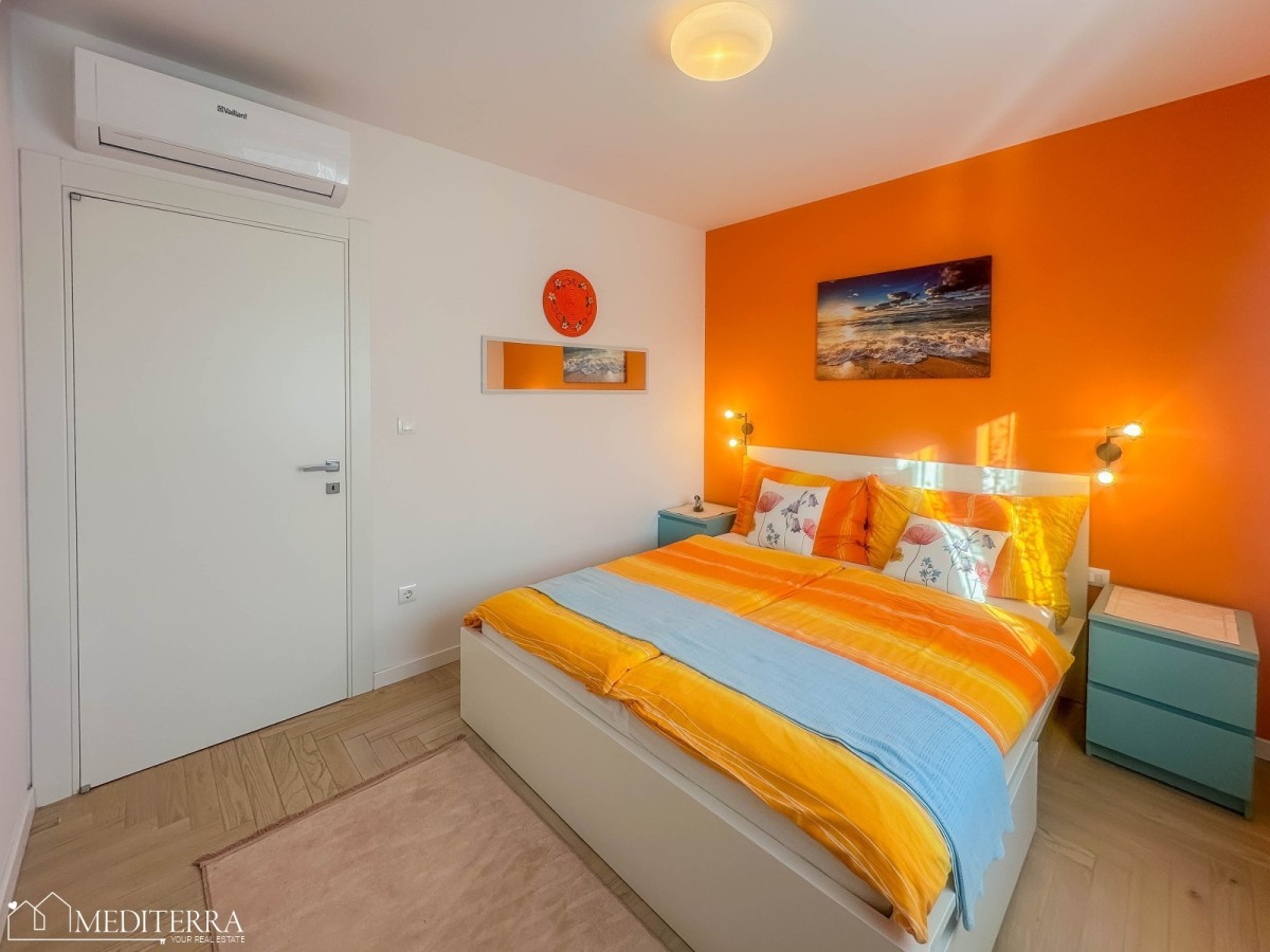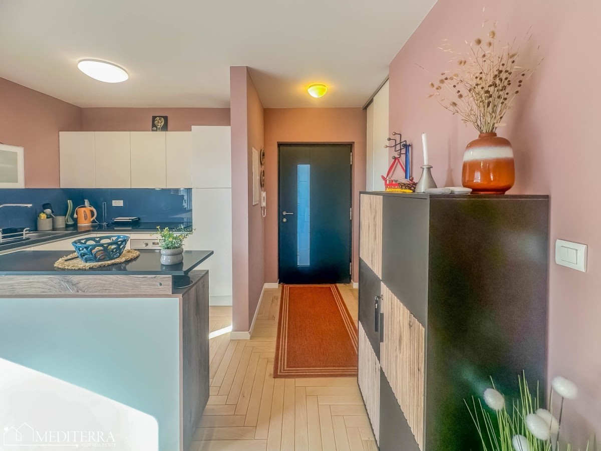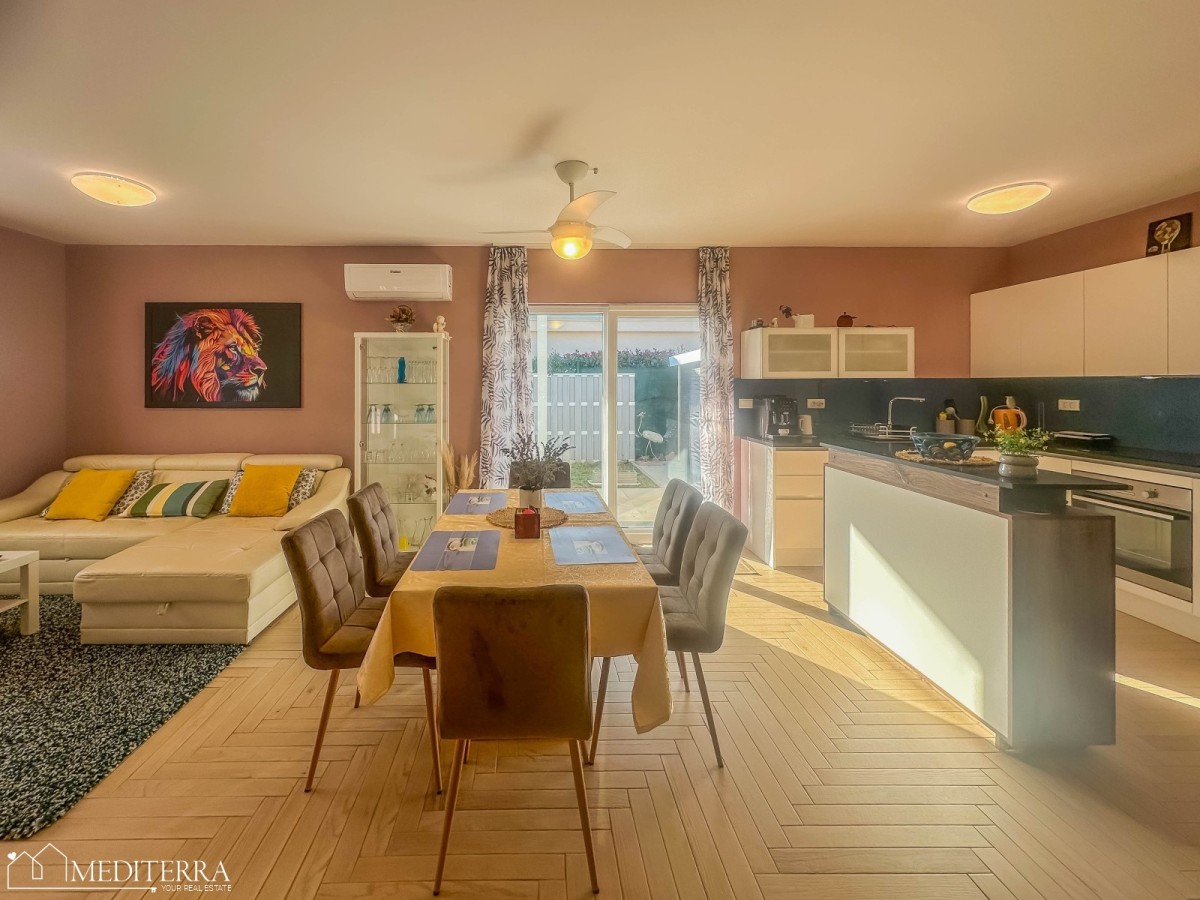 Površina ove dvojne prizemne kuće iznosi 93.20 m2. Kuća se sastoji od dnevnog boravka sa kuhinjom i blagovaonicom open space koncepta, 2 spavaće sobe, kupaonice i tehničke sobe. Raspored prostorija je jako dobar i svaki dio kuće je pametno iskorišten. Grijanje je putem klima uređaja. Kuća se prodaje kompletno namještena.