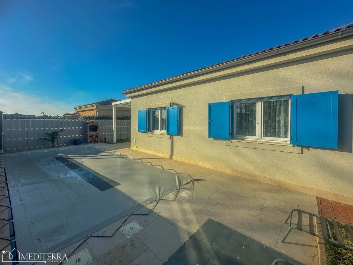 Površina uređene i ograđene okućnice iznosi 181 m2. Iz kuće se izlazi na terasu sa roštiljem, koja predstavlja prikladan prostor za druženje i uživanje na otvorenome. Pored terase se nalazi bazen sa sunčalištem i vanjskim tušem, idealan za uživanje u toplim ljetnim mjesecima. Pored terase se nalazi i vanjska drvena kućica koja može poslužiti kao dodatno spremište za bicikle, ležaljke, razne alate i slične stvari.