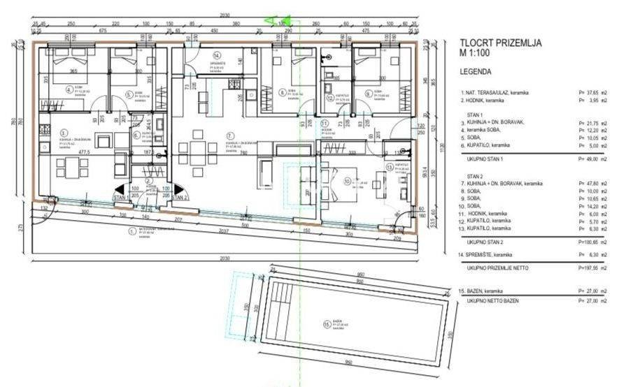 Prva stambena jedinica površine 50 m2 se sastoji od ulaznog hodnika, kuhinje sa dnevnim boravkom i blagavaonom, tri spavaće sobe, dvije kupaonice, spremište.