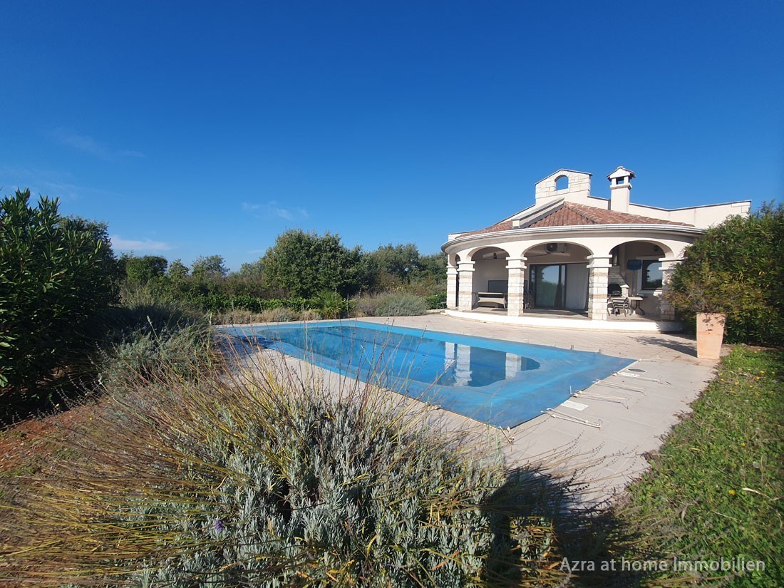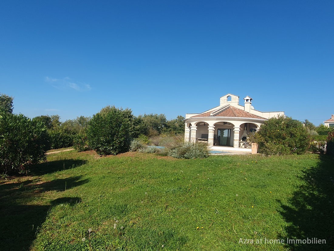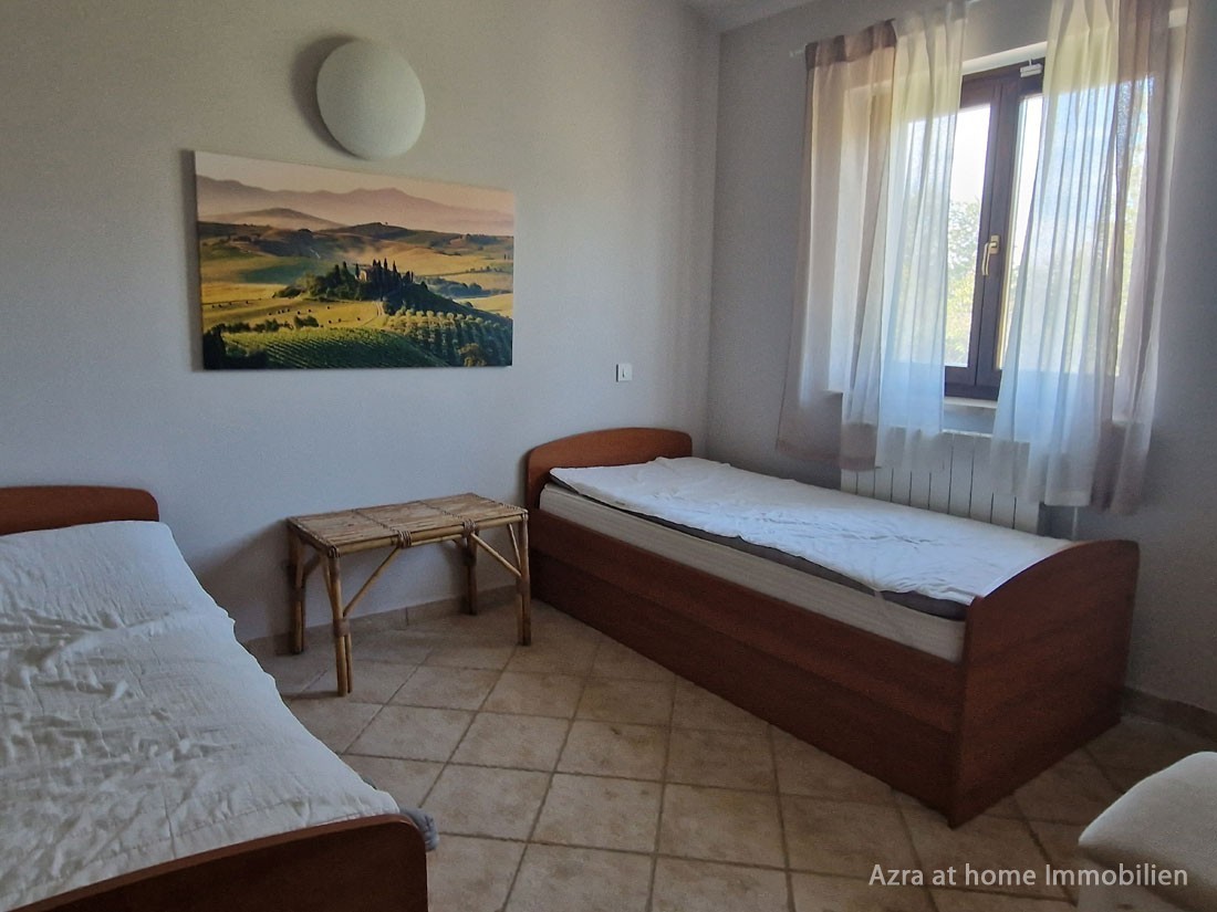Na ca.6km udaljenosti od mora i Poreča, smještena je ova samostojeća kuća ukupne površine ca.130 m2. Sastoji se od: predsoblja, kotlovnice, dnevnog boravka, kuhinje sa malom ostavom i blagovaonice, spavaće sobe sa vlastitom kupaonicom, hodnika, dvije spavaće sobe, kupaonice i terasa sa vanjskim kaminom / roštiljem. Na uređenom zemljištu površine ca.859m2 smješten je i bazen. Kuća je klimatizirana, ima centralno grijanje i prodaje se namještena. Djelomičan pogled na more.