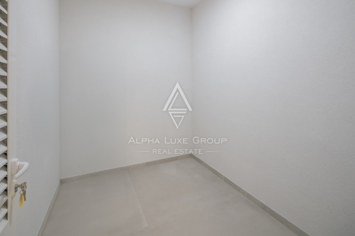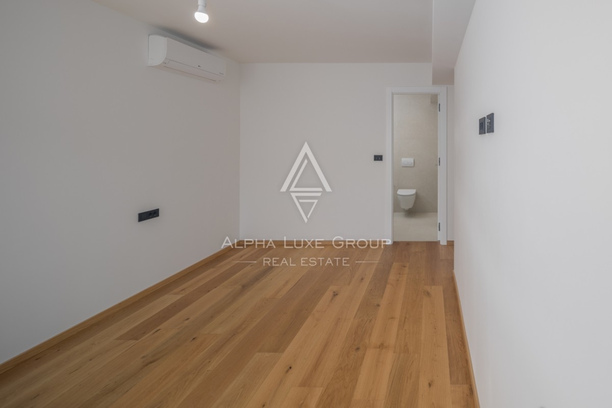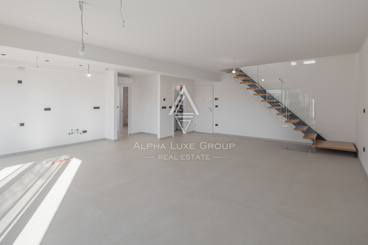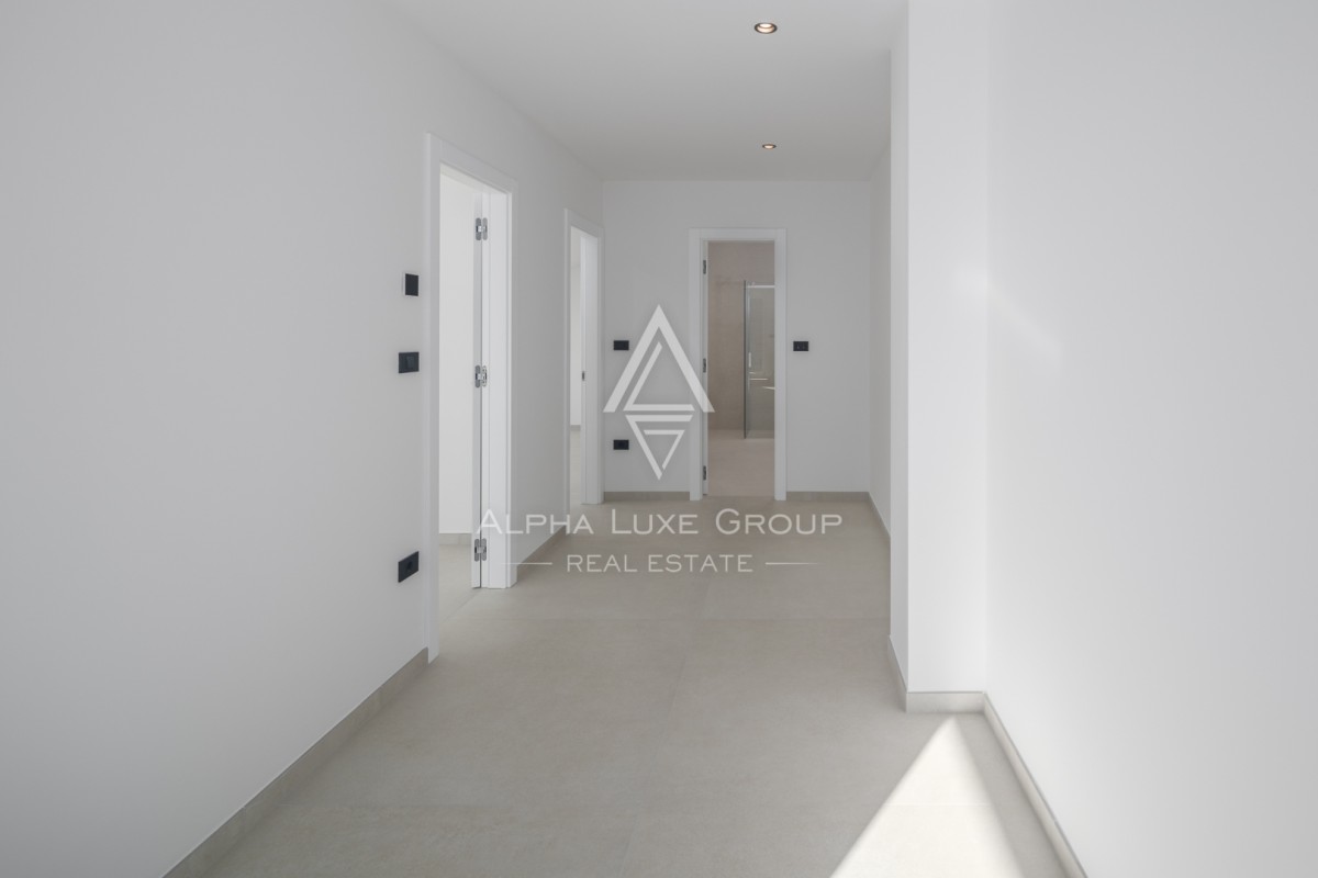 Stan se sastoji od četiri spavaće sobe, tri moderne kupaonice, prostrane dnevne zone te više terasa i balkona. Zahvaljujući zapadnoj orijentaciji, stan obiluje prirodnim svjetlom tijekom cijelog dana. Balkon nudi predivan pogled na more, naglašavajući luksuzan i opuštajući karakter prostora.