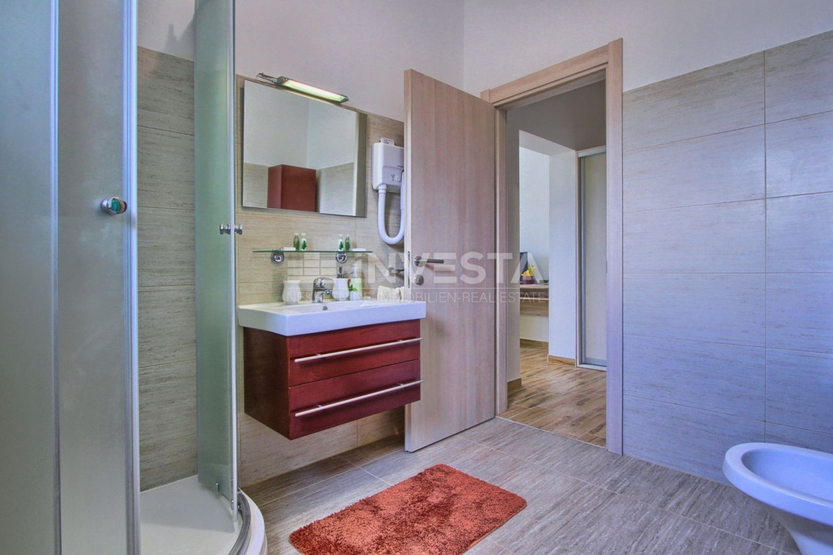 Spavaća soba sa vlastitim predprostorom i kupatilom (Tuš kada, bide, WC školjka, umivaonik), opremljena vlastitim klima uređajem,SAT/ TV-om, cca 22 m2