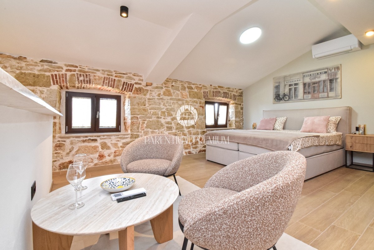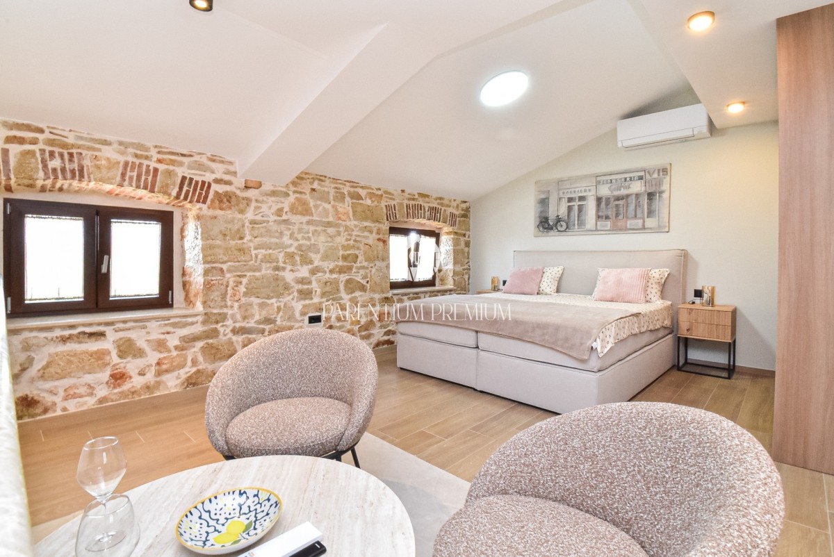 Unutarnje stubište, ukrašeno autentičnim istarskim kamenom i staklenim stijenama, vodi na prvi kat gdje se nalazi spavaća soba i kupaonica, dok se na drugom katu smjestila još jedna prostrana spavaća soba s vlastitom kupaonicom.