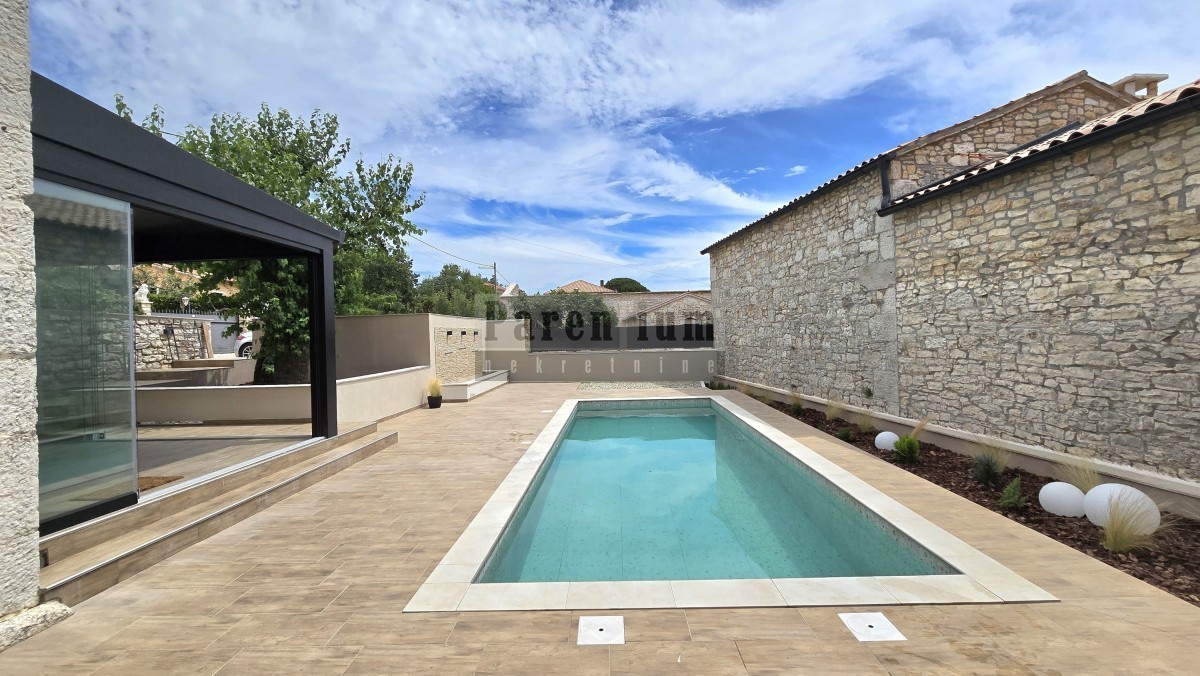 Na uređenom i ograđenom dvorištu površine 353 m2 nalazi se parking, bazen površine 24 m2 (8x3m) te pomoćna prostorija koja može služiti kao wellness, spremište ili konoba.