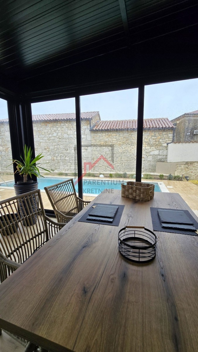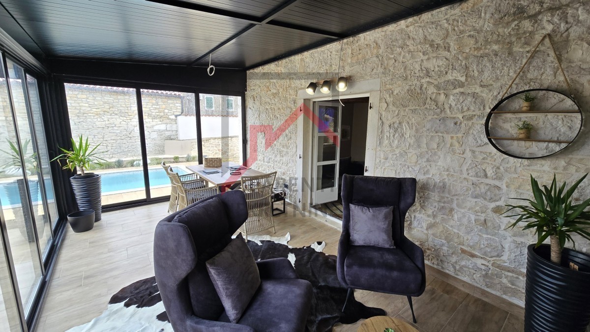 Kuća se prodaje kompletno renovirana i kompletno namještena. Spoj tradicionalne istarske kamene kuće u spoju sa modernom funkcionalnošću. U kući je postavljeno podno grijanje te 4 klima uređaja - u svakoj spavaćoj sobi te u dnevnom boravku.