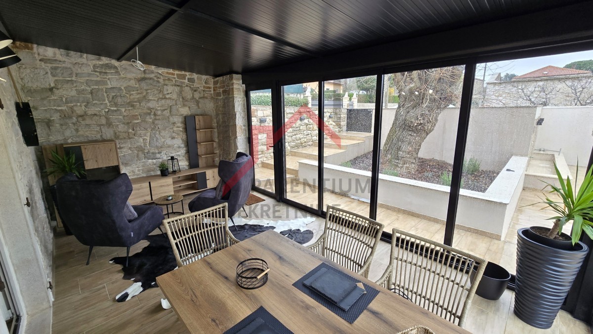 Prizemlje kuće sastoji se od predivnog dnevnog boravka sa kaminom te izlazom na zatvorenu terasu - zimski vrt i uređeno dvorište, kuhinje sa blagovaonom te toaleta, dok se kat kuće sastoji od tri spavaće sobe, svaka sa klima uređajem te centralnim kupatilom.