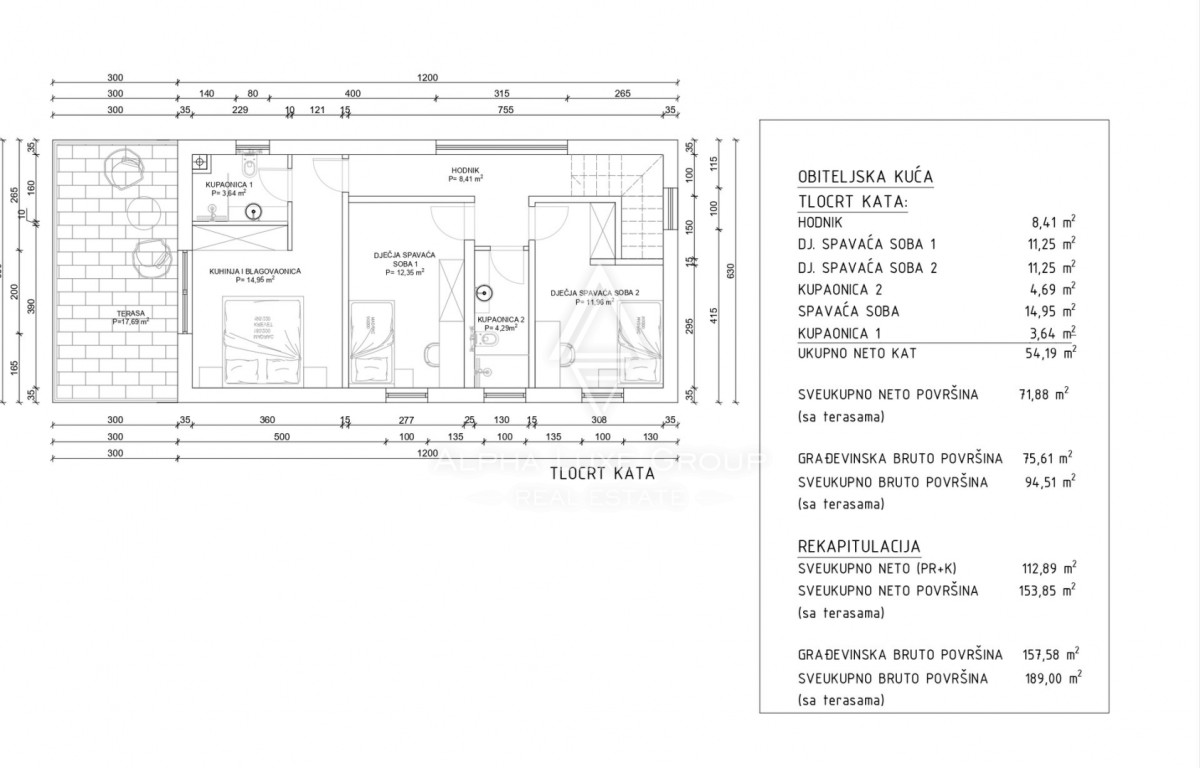 Kuća će se sastojati od dvije etaže: prizemlje i kat, sveukupne neto površine 155 m2, smještena na zemljištu površine 844 m2.