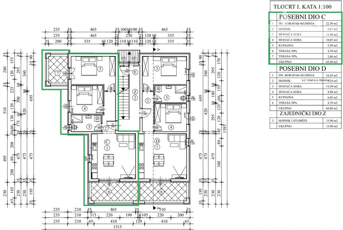 Prodaje se stan od 65,60 m2 na prvom katu stambene zgrade koja se sastoji od ukupno 5 stambenih jedinica, u okolici Poreča.