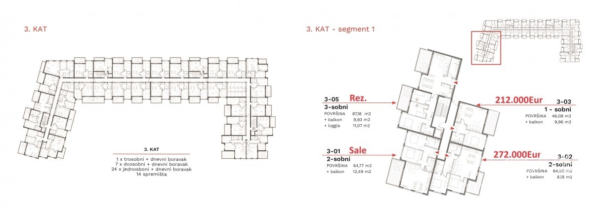 U nastavku možete pregledati slike zgrade zajedno s tlocrtima koji ističu odgovarajuće cijene pojedinih stanova.