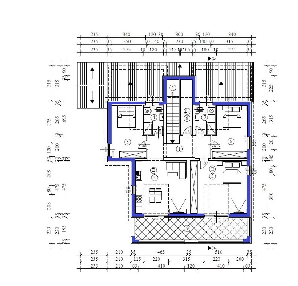 Stan E na drugom katu – potkrovlje, neto površine 109,64 m2 ( stubište, tri spavaće sobe, dva kupatila, kuhinja sa dnevnim boravkom, ostava i terasa ).