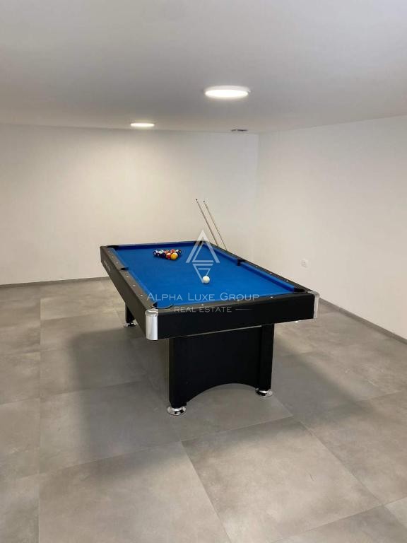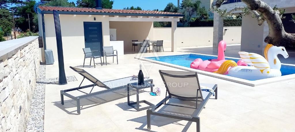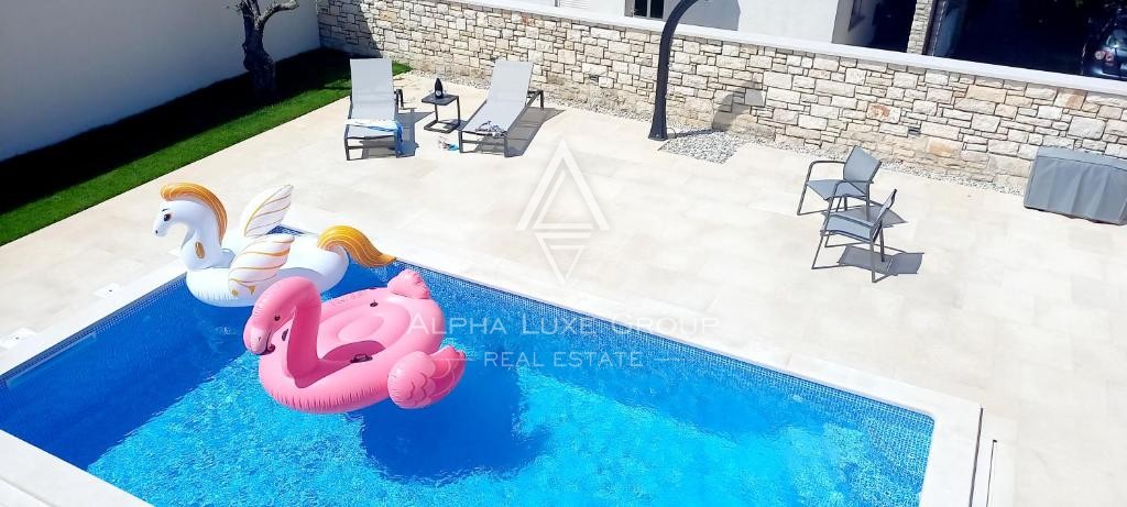 Kuća je izgrađena od visokokvalitetnih materijala i opremljena klima uređajem te toplinskom pumpom za učinkovito grijanje i hlađenje. Privatni vrt uključuje bazen, sunčalište, ljetnu kuhinju i uređen okoliš. Dodatno, nekretnina ima i dva parkirna mjesta.