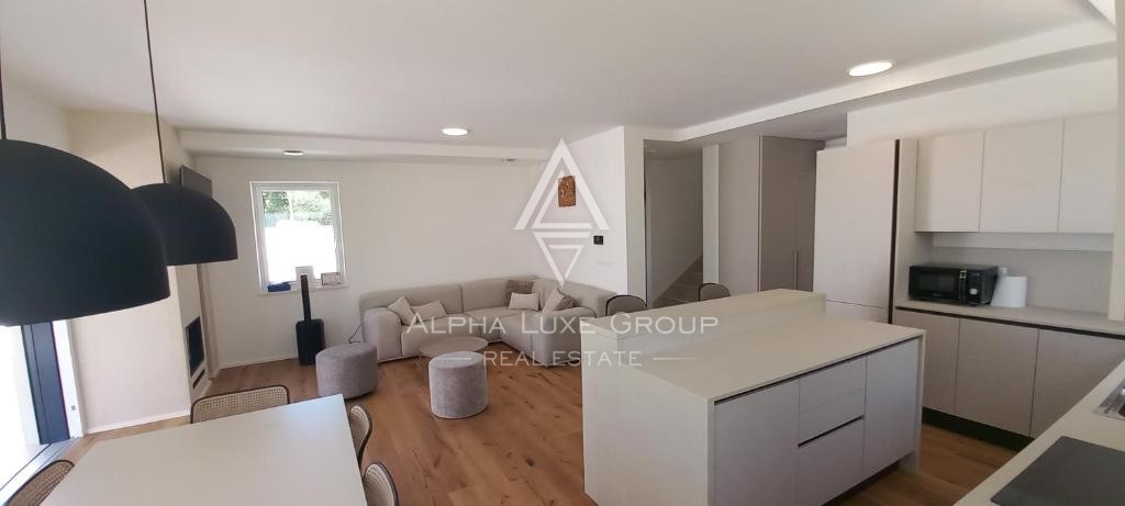 Ova moderna kuća za odmor s bazenom i prekrasnim pogledom na more smještena je u mirnom području blizu Umaga. Nekretnina se prostire na podrum, prizemlje, prvi kat i krovnu terasu. Stambena površina iznosi 193,55 m², dok podrum pruža dodatnih 27,68 m² prostora.