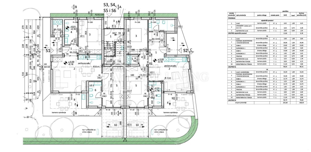 Stan S1 ukupne neto površine 109,08 smješten je u prizemlju zgrade i sastoji se od ulaznog hodnika, kuhinje sa blagovaonom i dnevnim boravkom otvorenog tipa, dvije spavaće sobe, dvije kupaonice, praone, prostrane natkrivene terase površine 9,50 te nenatkrivene terase/sunčališta površine 11,45 m2.