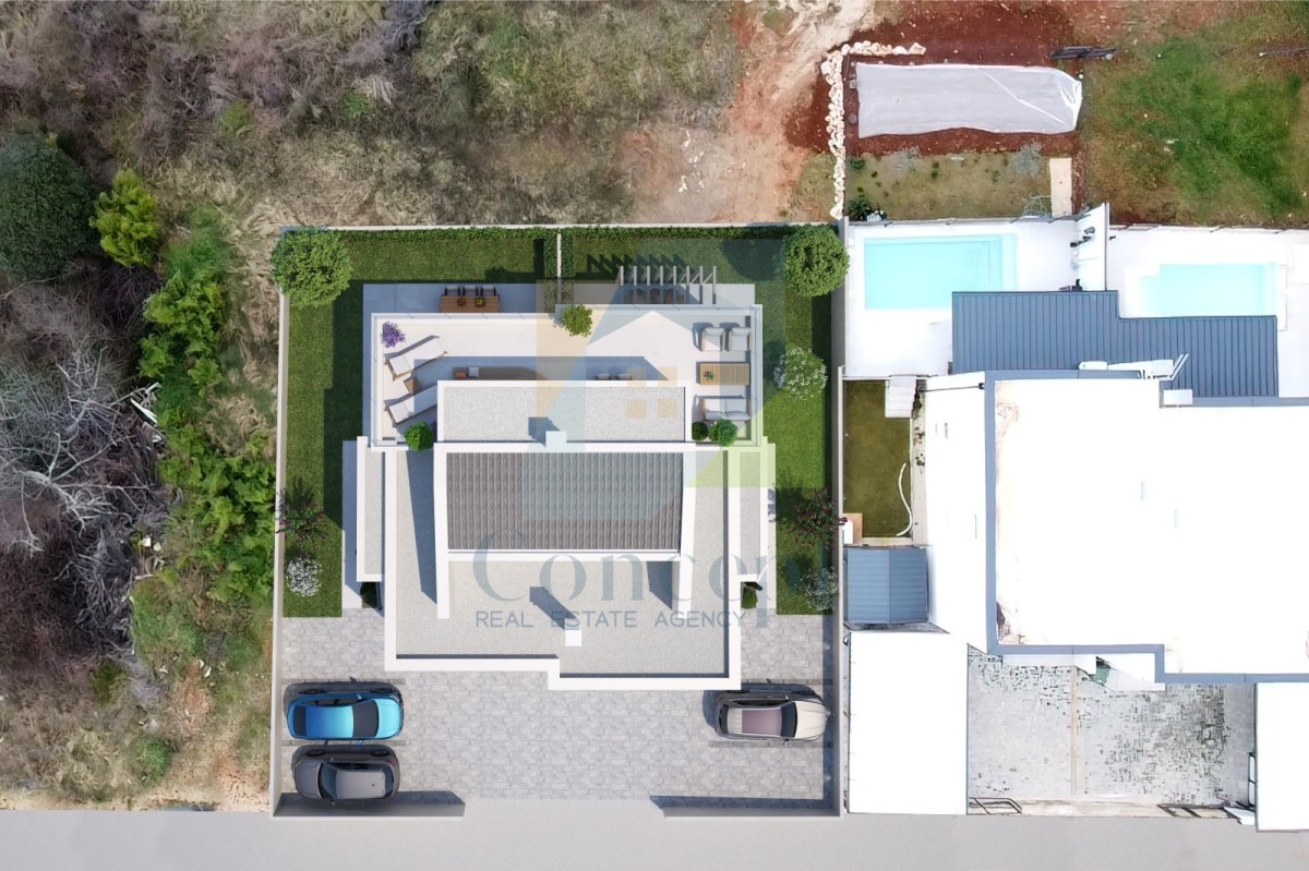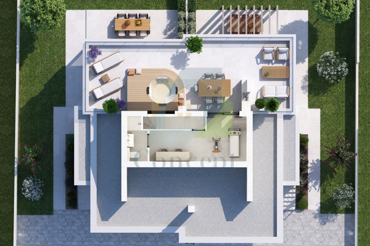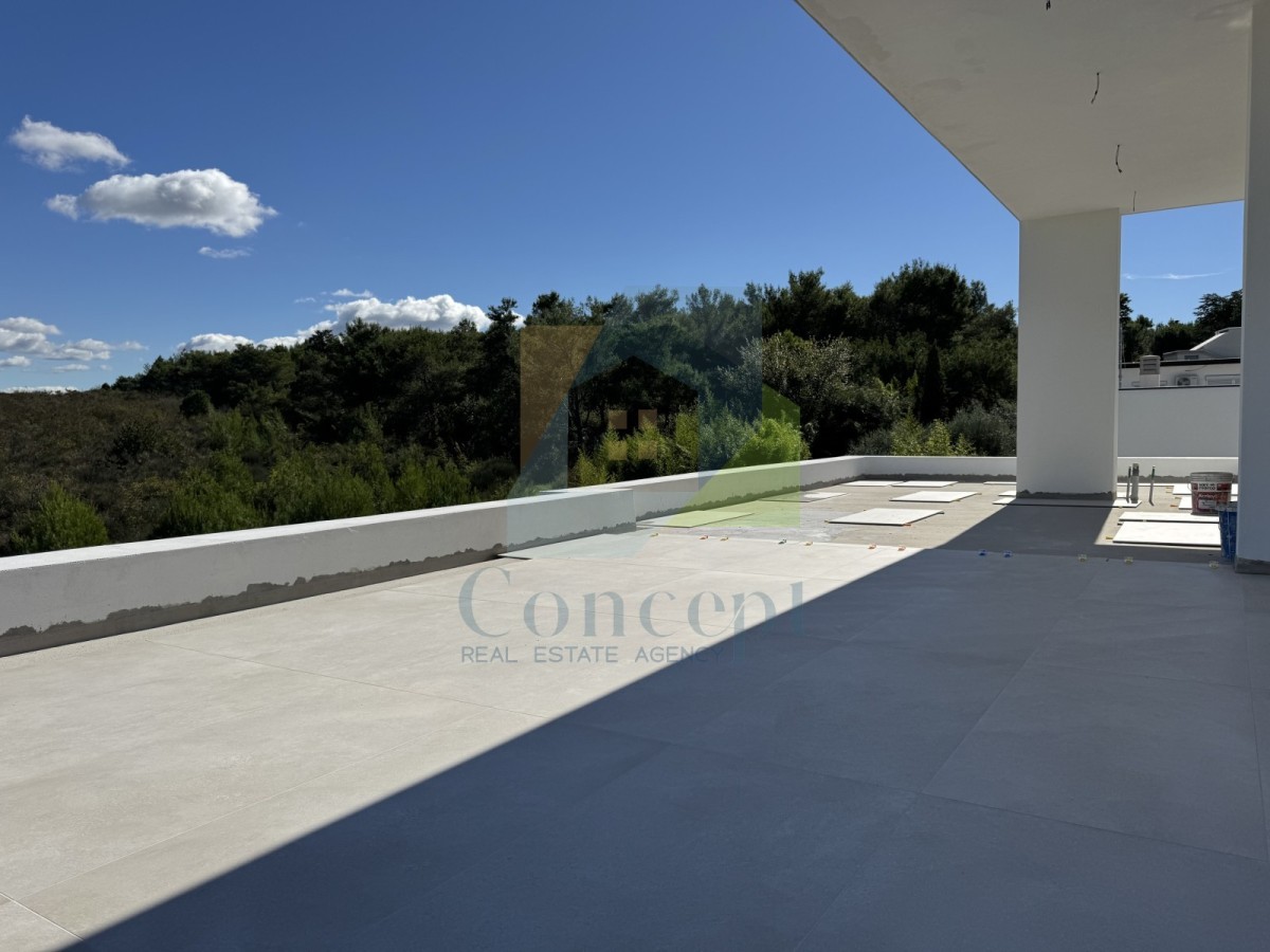 Krovna terasa površine oko 55 m², od čega je približno 20 m² natkriveno, pruža prostor za smještaj ljetne kuhinje i blagovaonskog dijela na otvorenom. S terase se pruža pogled na prirodu i more, a predviđena je priprema za ugradnju solarnih panela.