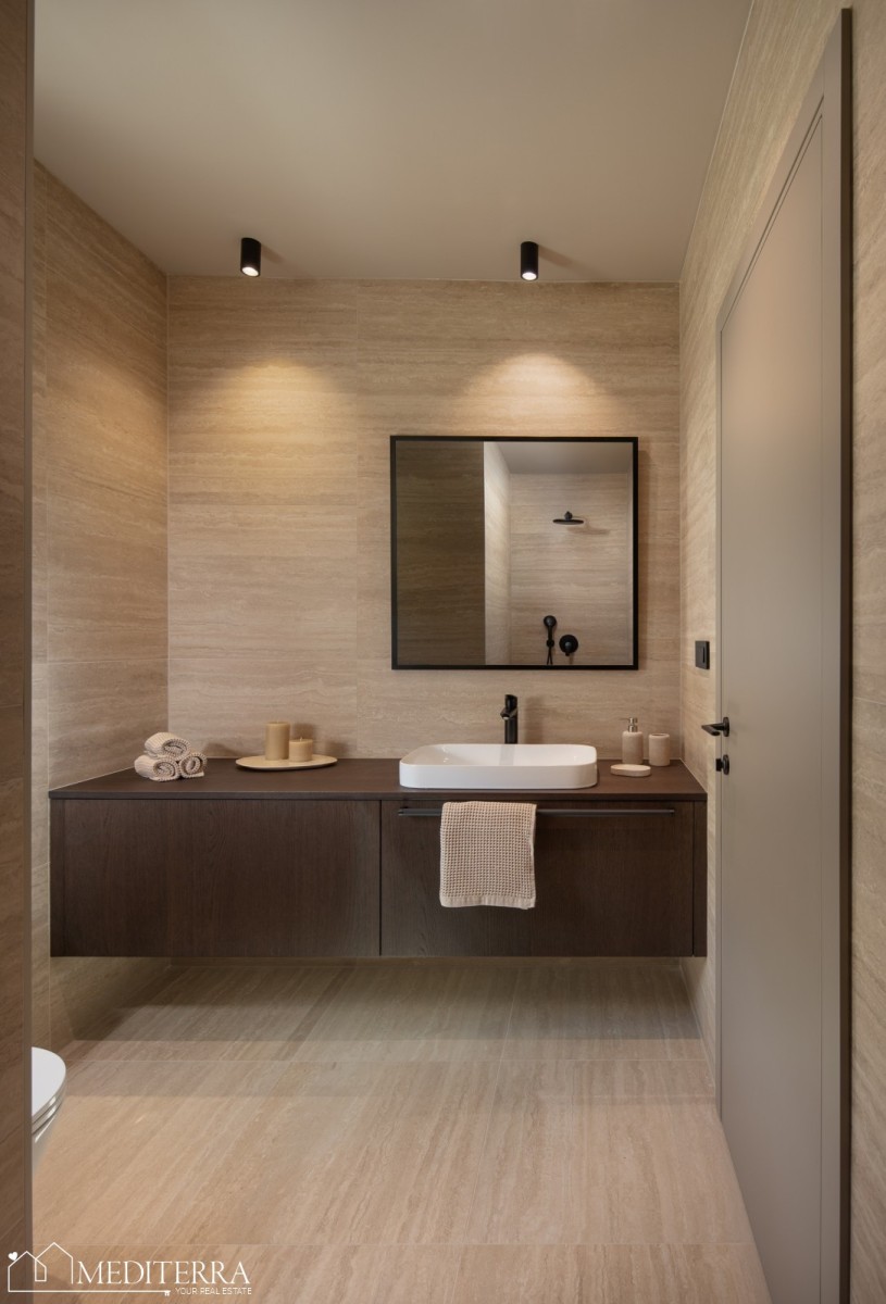 Vila je na prodaju u potpunosti opremljena i namještena. Opremljena je podnim grijanjem na dizalicu topline koje se proteže kroz cijeli objekt, a za dodatnu udobnost tu su i klima uređaji. Moderan arhitektonski stil, luksuzni detalji i velike staklene stijene koje omogućuju obilje prirodnog svjetla daju ovoj vili poseban šarm.