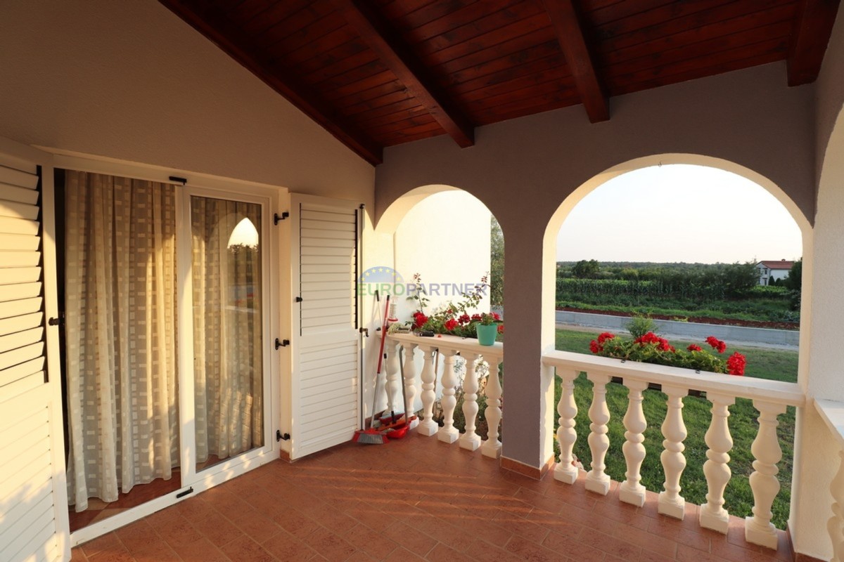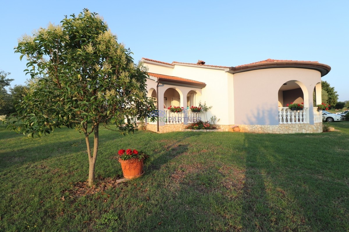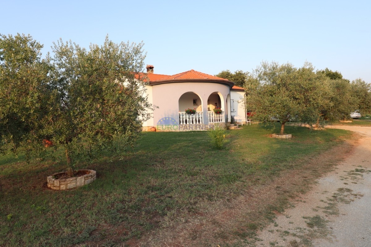 Ova simpatična prizemnica nalazi se u mirnom selu u blizini Višnjana. Smještena je na velikoj okućnici od 5286 m2. Stambena površina kuće iznosi 133 m2 te se sastoji od ulaznog trijema, hodnika, toaleta, kuhinje, blagovaonice, dnevnog boravka sa izlazom ne terasu, tri spavaće sobe, kupaonice i kotlovnice. Kuća ima potkrovlje koje se može urediti i dodatno iskoristiti kao stambeni ili radni prostor. Na prostranoj i uređenoj okućnici nalazi se travnjak sa maslinama, cvijeće te autohtono mediteransko bilje. Kuća ima vlastiti prilaz i parkirna mjesta za nekoliko vozila. Okružena poljoprivrednim zemljištem, svojim vlasnicima osigurava apsolutni mir i privatnost.