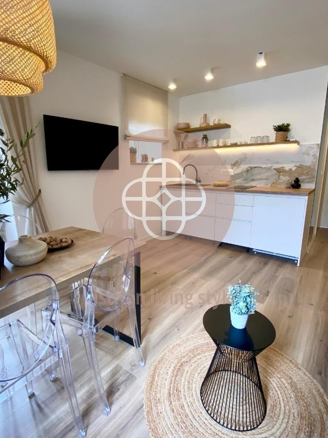 Opremljen drvenim podovima i keramikom u izgledu drveta, ovaj s ljubavlju renoviran stan impresionira svojom čistoćom. Otvoreni prostor u kuhinji, dnevnom boravku i blagovaonici, dvije spavaće sobe s krevetima s oprugama (jedna bračna - jedna s 2 odvojena kreveta), šik mala kupaonica s tuš kabinom i visokokvalitetnim instalacijama marke. O svemu se razmišljalo i kompletno će se predati novom vlasniku.