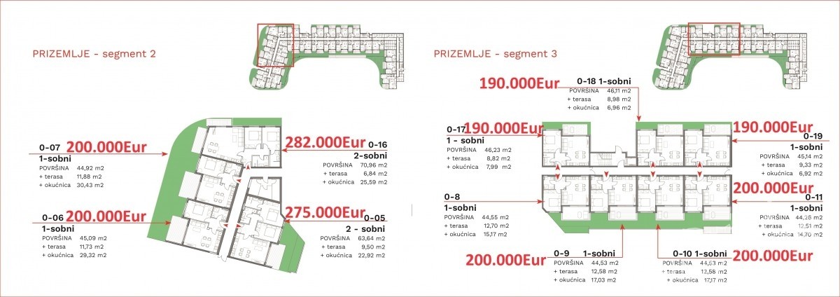 Di seguito è possibile visualizzare le immagini dell'edificio insieme alle planimetrie che evidenziano i rispettivi prezzi dei singoli appartamenti.