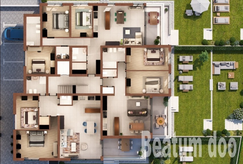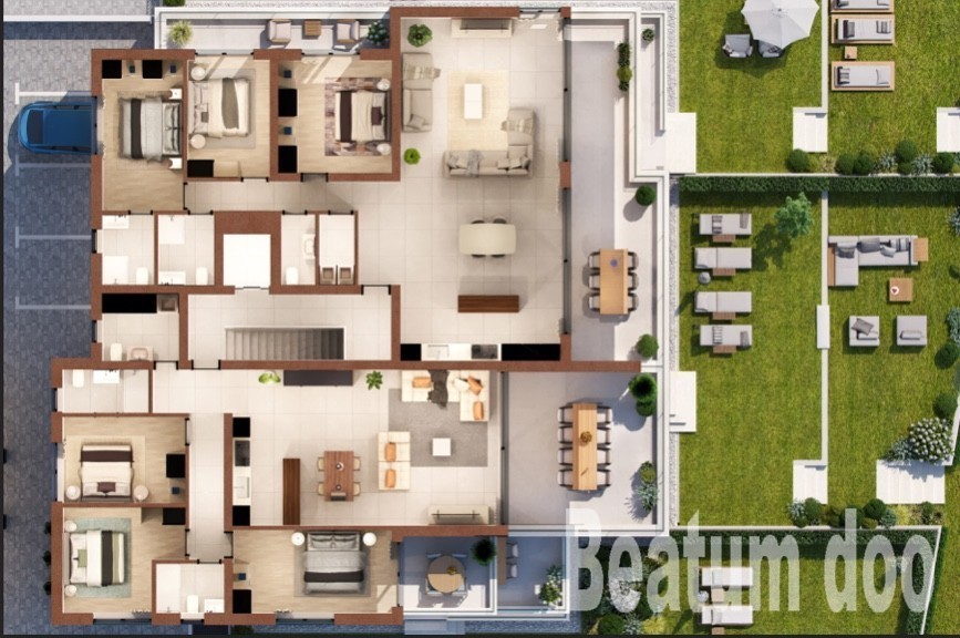 Due camere da letto, un bagno, un WC, cucina, sala da pranzo, soggiorno, ripostiglio, lavanderia, terrazzo, giardino