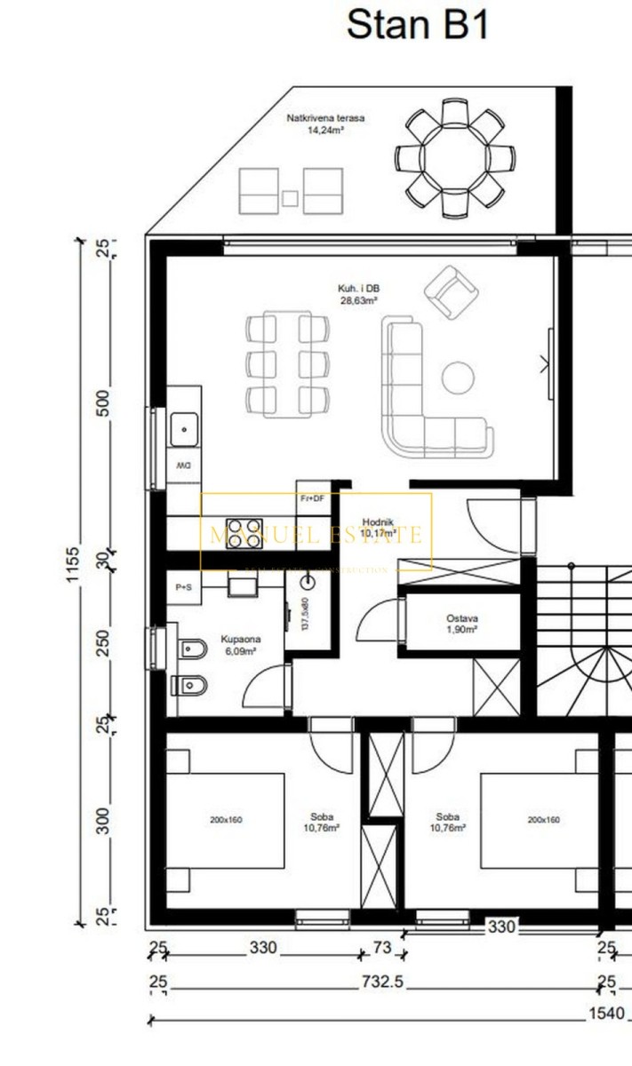 L'appartamento al piano terra (B1) della superficie abitabile complessiva di 77 mq sarà composto da ingresso, ripostiglio, due camere da letto, bagno, cucina + pranzo + soggiorno disposto secondo il principio dell'open-space; il soggiorno avrà pareti di vetro e accesso ad una terrazza coperta e ad un ampio giardino di 240 m2. Riscaldamento/raffreddamento con aria condizionata. Riscaldamento a pavimento. Porte d'ingresso antieffrazione e resistenti al fuoco. Bagno attrezzato con sanitari. I clienti possono scegliere autonomamente la ceramica. Viene venduto non arredato. Due posti auto.