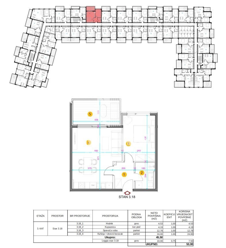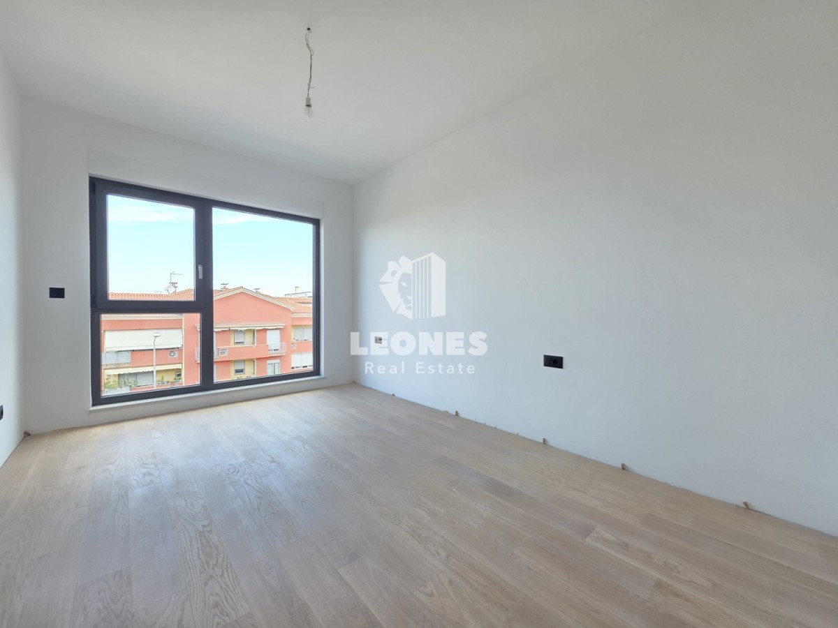 Appartamento in vendita al terzo piano di un nuovo edificio di pregio a Umago. La superficie netta utile dell'appartamento è di 53 m². È composto da soggiorno e cucina, camera da letto, bagno e loggia. Dispone di un ripostiglio di 3,75 m², un posto auto in garage e un posto auto esterno.