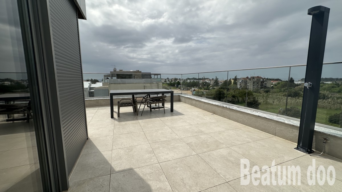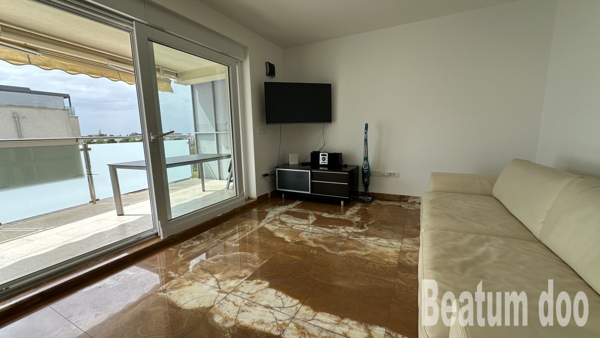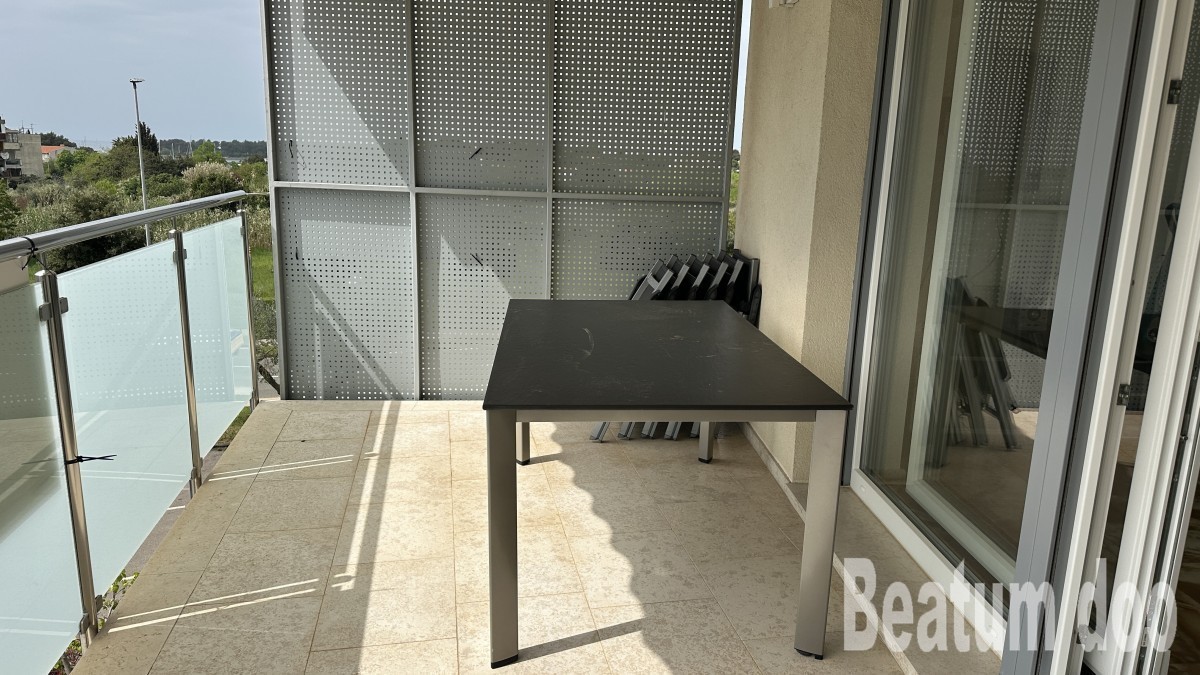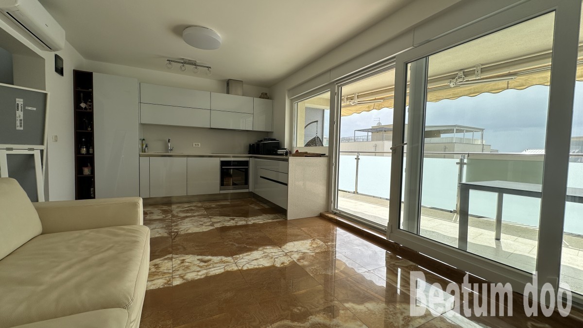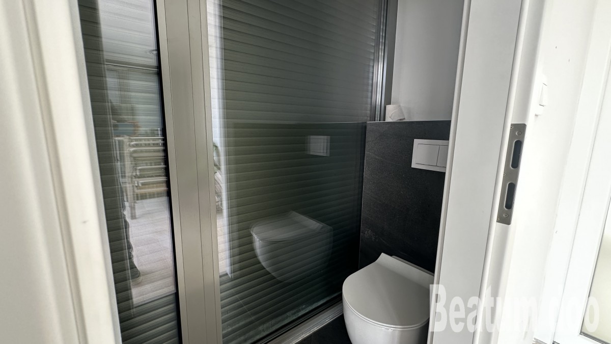 Appartamento al secondo piano, di 62 m2, con terrazza sul tetto di 32 m2, due posti auto di 25,00 m2 e un ripostiglio di 3 m2, vista mare dalla terrazza e dalla terrazza sul tetto, riscaldamento a pavimento, aria condizionata in ogni stanza, sul tetto si trovano un bagno, un ripostiglio, una jacuzzi, una doccia e un barbecue, con mobili.
