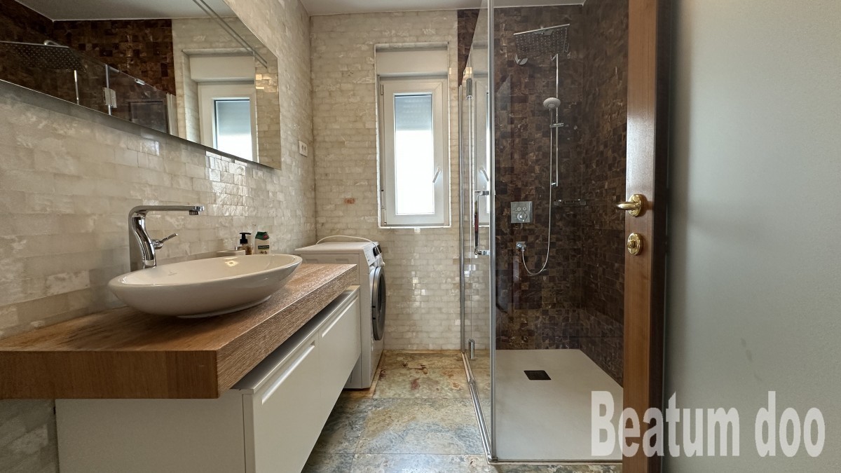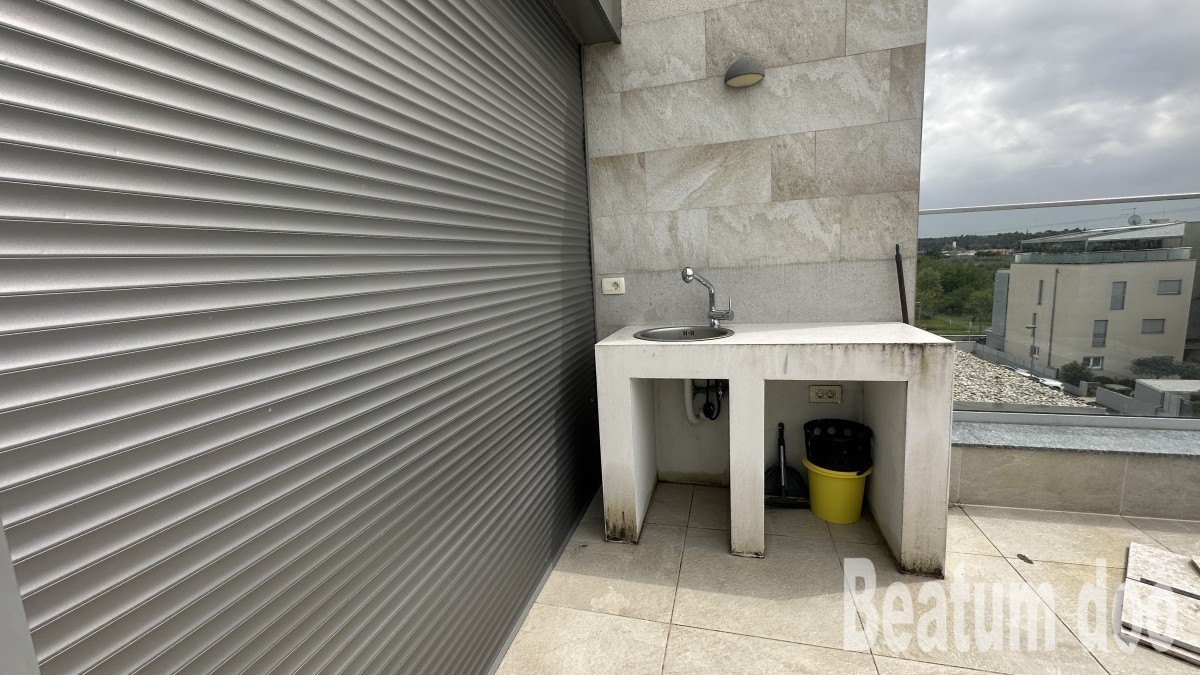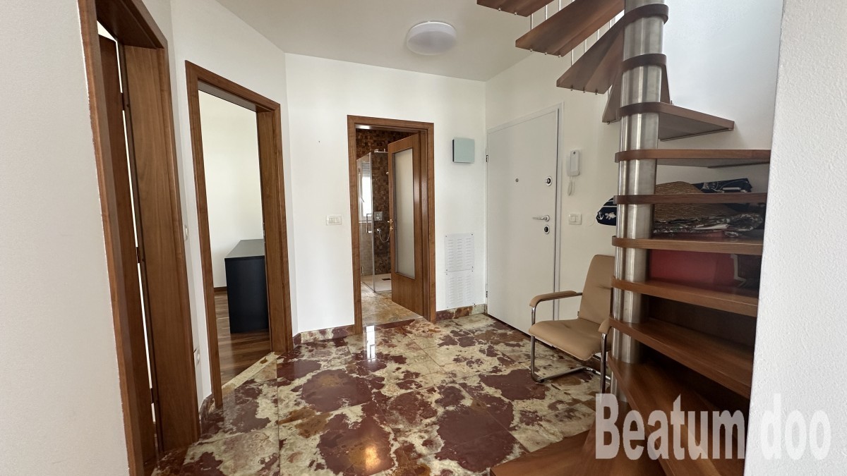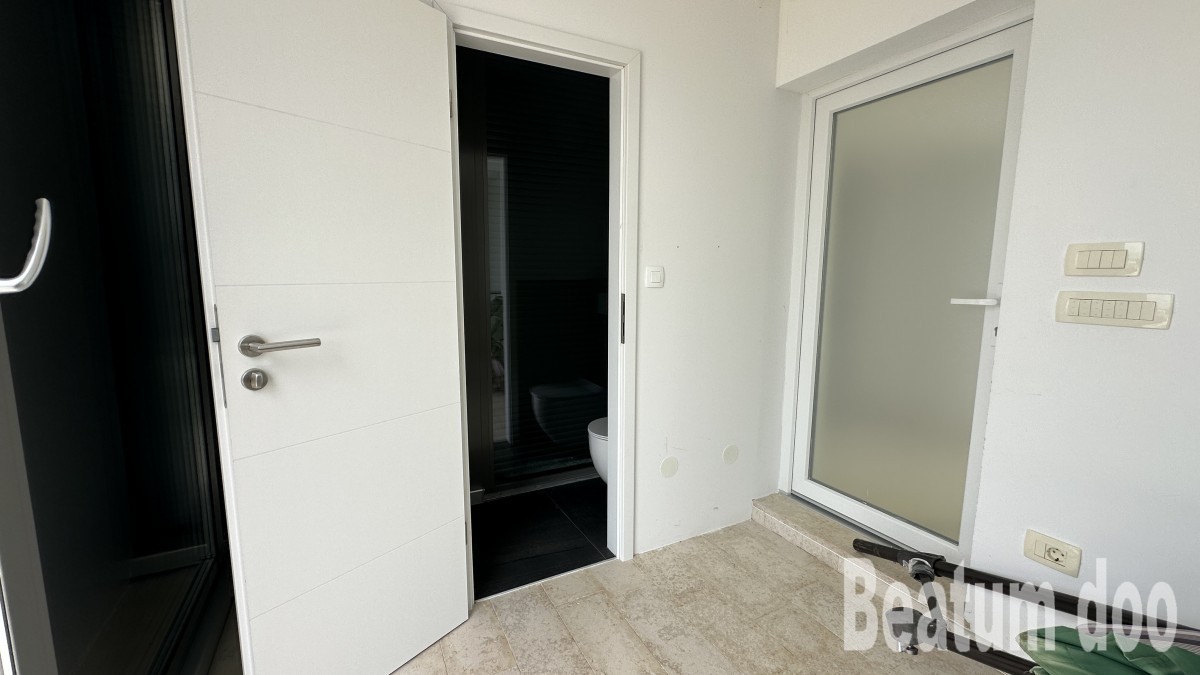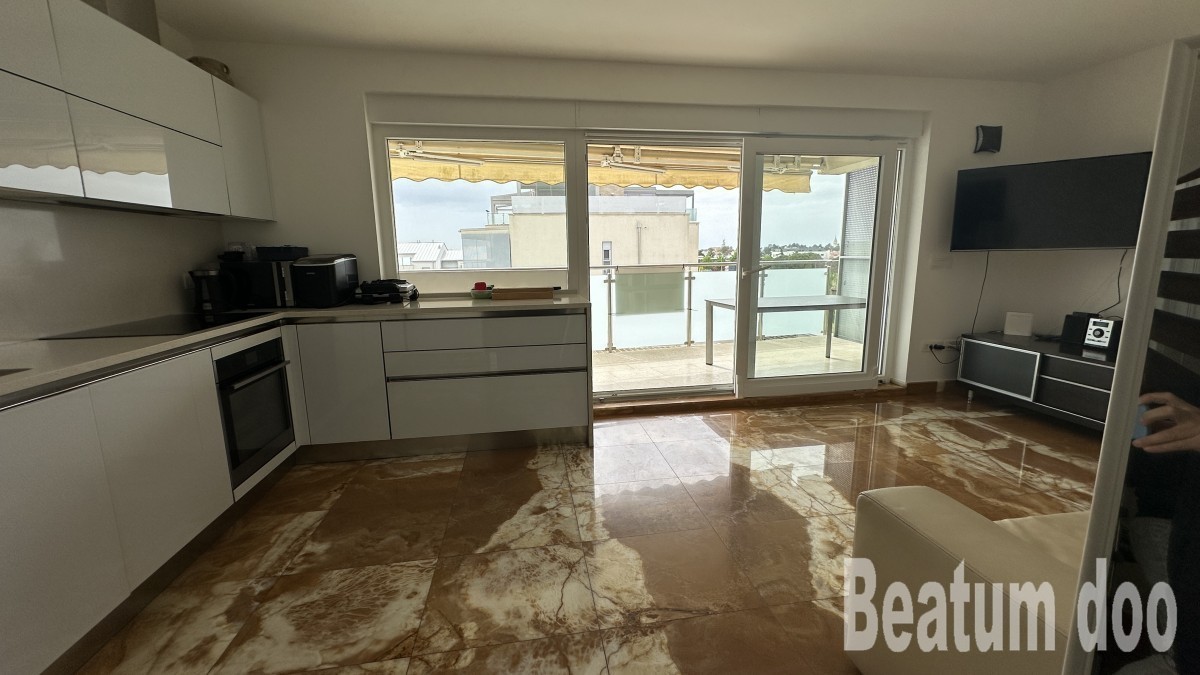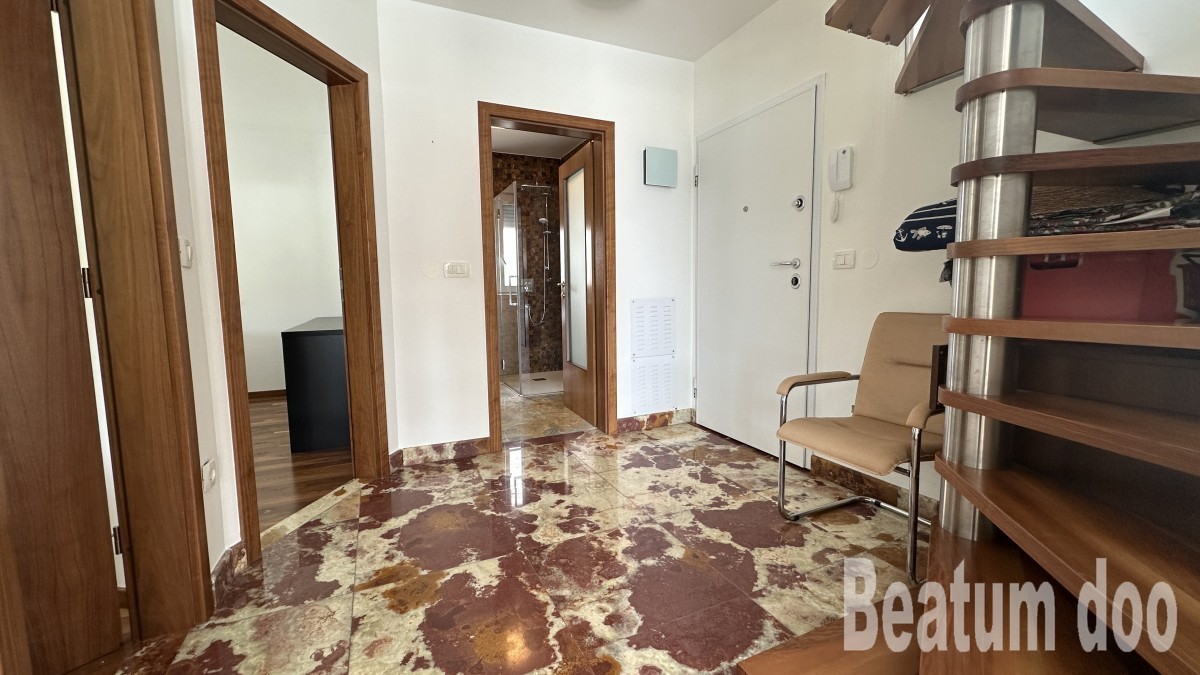 Appartamento al secondo piano, di 62 m2, con terrazza sul tetto di 32 m2, due posti auto di 25,00 m2 e un ripostiglio di 3 m2, vista mare dalla terrazza e dalla terrazza sul tetto, riscaldamento a pavimento, aria condizionata in ogni stanza, sul tetto si trovano un bagno, un ripostiglio, una jacuzzi, una doccia e un barbecue, con mobili.