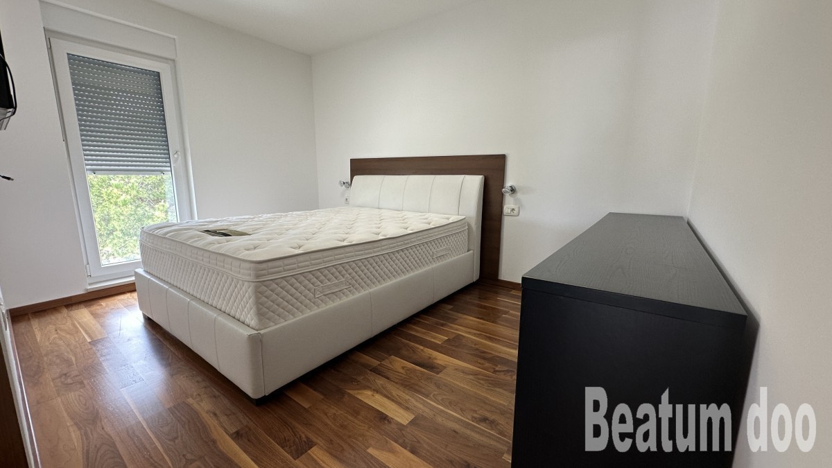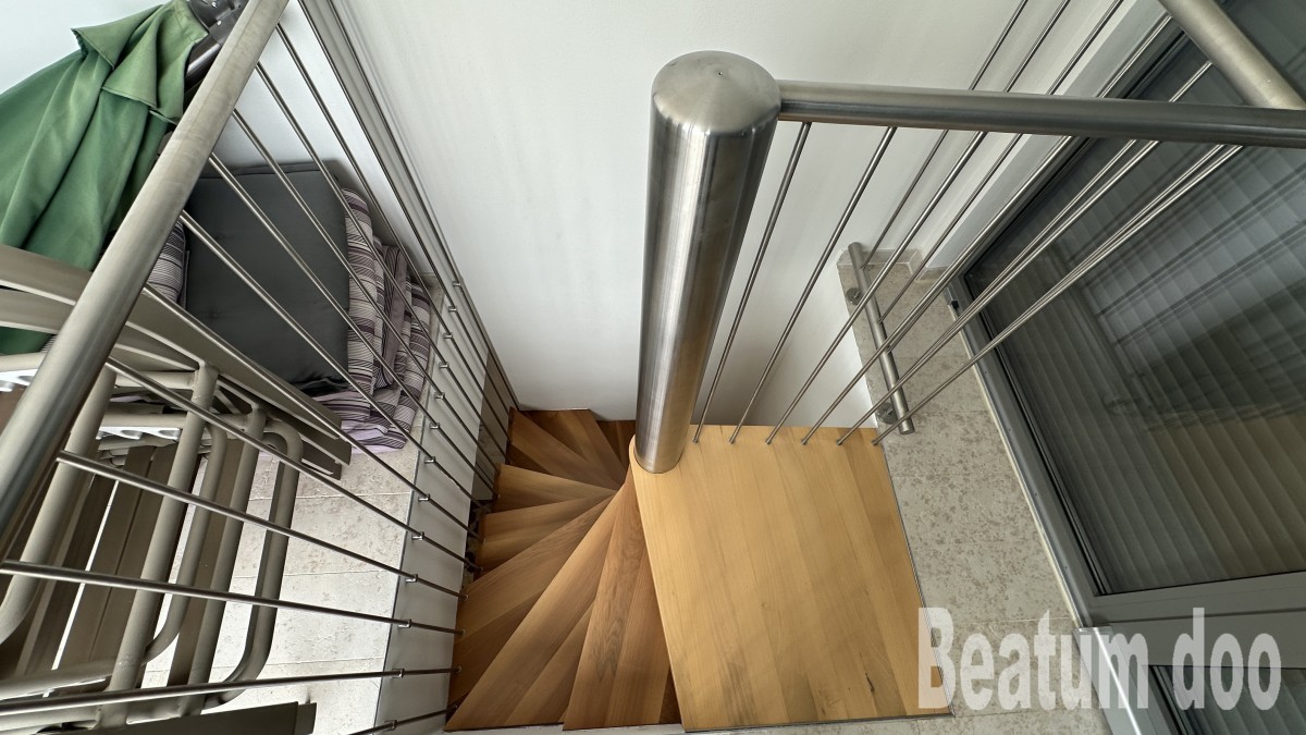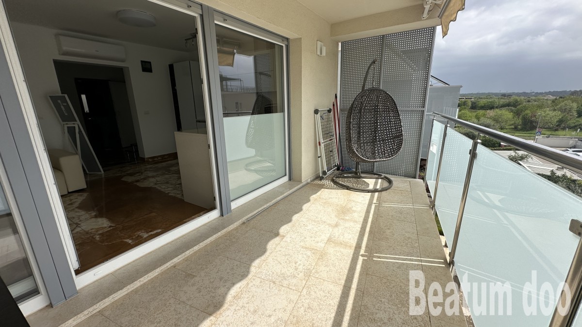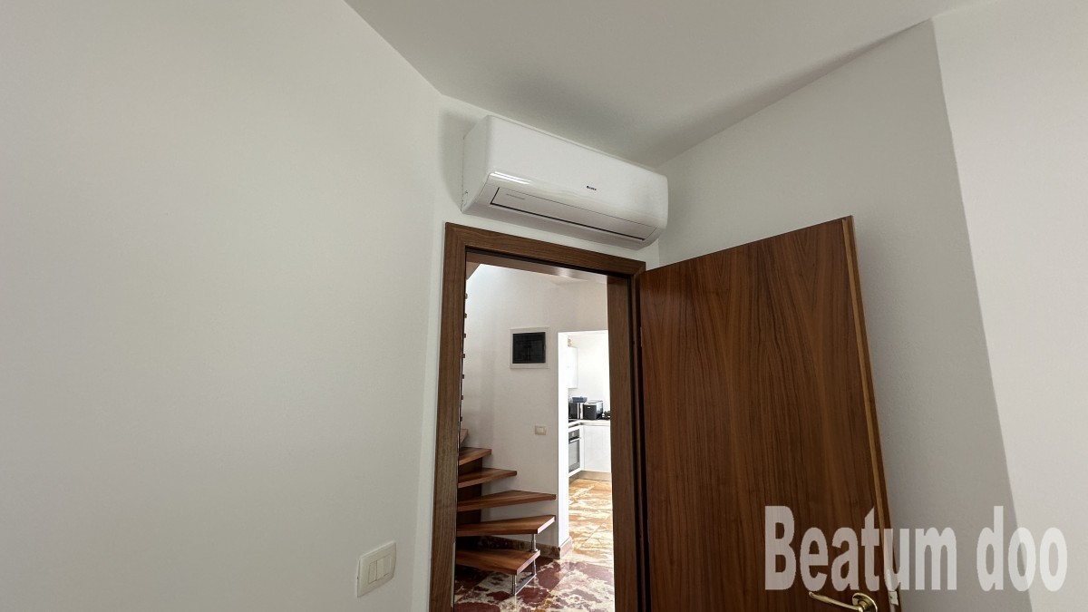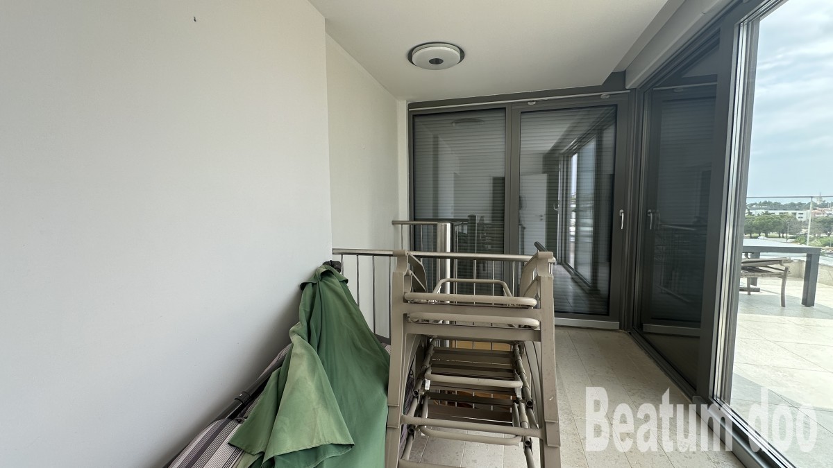 Appartamento al secondo piano, di 62 m2, con terrazza sul tetto di 32 m2, due posti auto di 25,00 m2 e un ripostiglio di 3 m2, vista mare dalla terrazza e dalla terrazza sul tetto, riscaldamento a pavimento, aria condizionata in ogni stanza, sul tetto si trovano un bagno, un ripostiglio, una jacuzzi, una doccia e un barbecue, con mobili.
