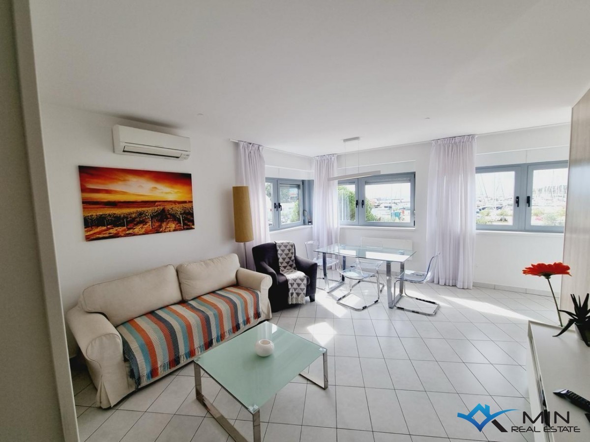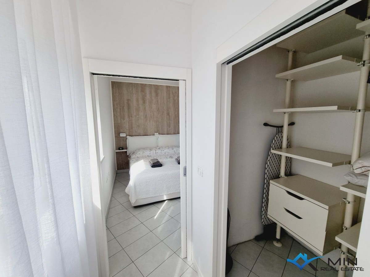 Vendesi appartamento in ottima posizione a 50 m dal centro cittadino. L'appartamento si trova in una delle posizioni più attraenti di Cittanova (70 m dal mare e 100 m dalla spiaggia) e tutti i servizi sono nelle vicinanze. L'appartamento è di 64 mq ed è composto da un disimpegno, bagno, balcone, camera da letto e un open space dove si trova la cucina con sala da pranzo e un soggiorno. Il soggiorno offre una bellissima vista sul mare e sul porto turistico. L'appartamento dispone di 1 posto auto protetto da rampa. L'appartamento può essere utilizzato per scopi residenziali o turistici.