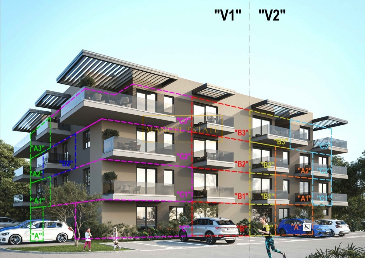 Appartamento monolocale (V1-B3) situato al terzo piano di un edificio residenziale in costruzione, vicino a Parenzo, Tar - Vabriga. Superficie abitabile totale di 52,86 m2. Si compone di: ingresso, corridoio, bagno, camera e soggiorno; cucina + sala da pranzo + soggiorno con accesso al terrazzo; + terrazza sul tetto di 9,70 m2.
