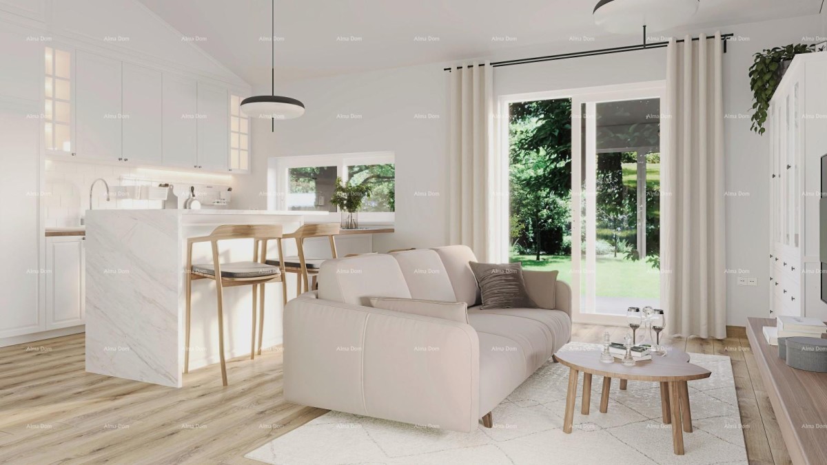Soggiorno, sala da pranzo e cucina a pianta aperta con accesso alla terrazza e al giardino.