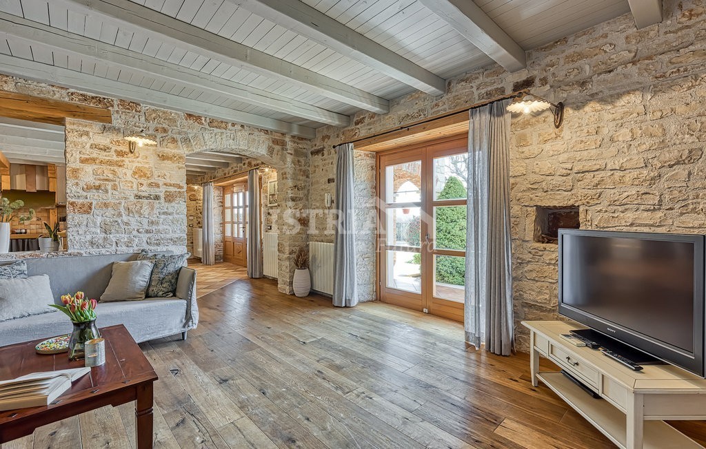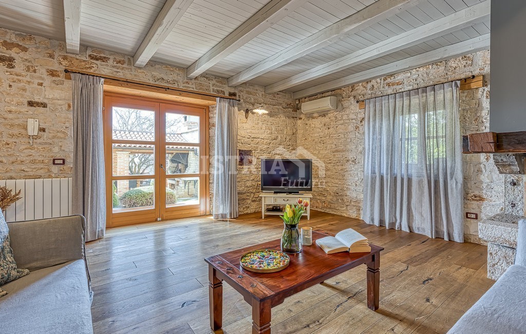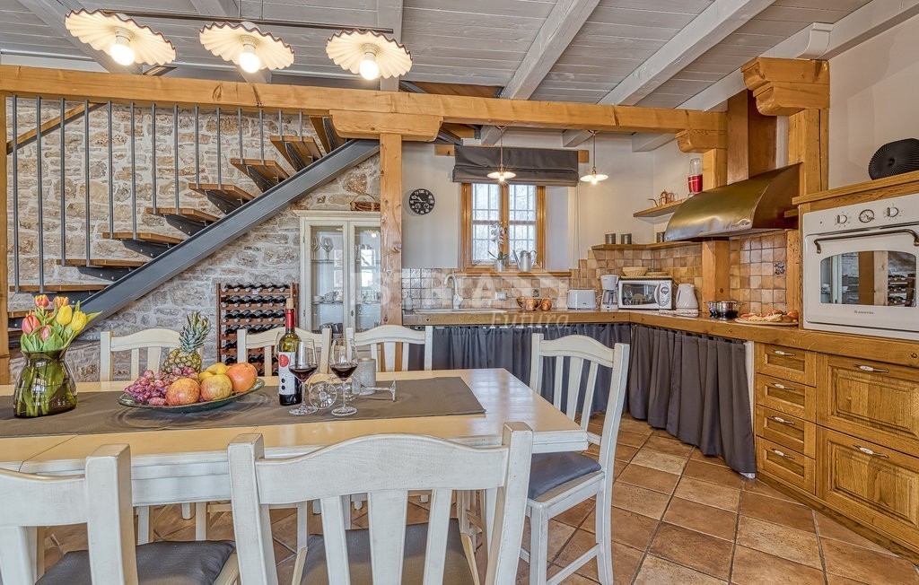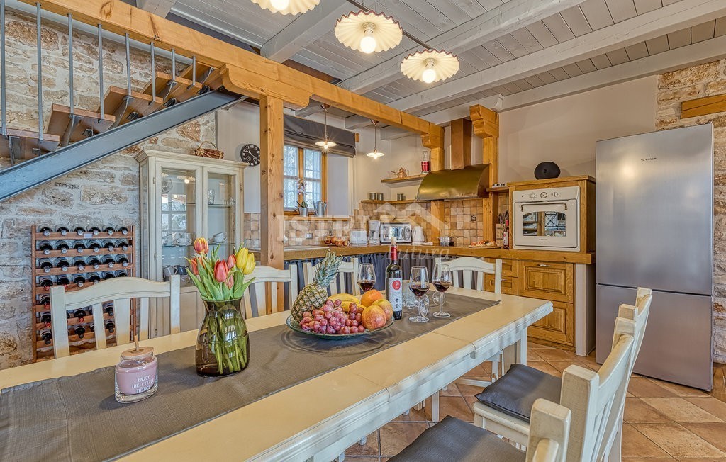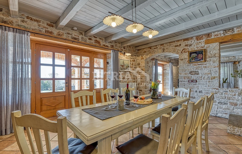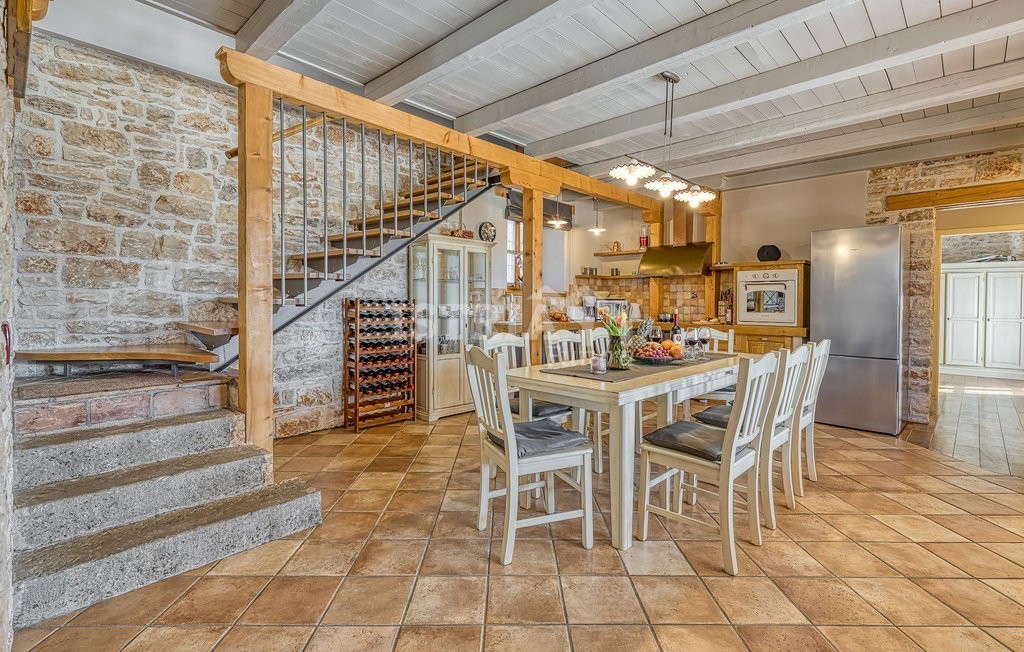 In vendita una splendida villa in pietra di 200 m² distribuiti tra piano terra e primo piano, situata su un terreno recintato e curato di 1.030 m², a 13 km dal centro di Parenzo e dal mare.