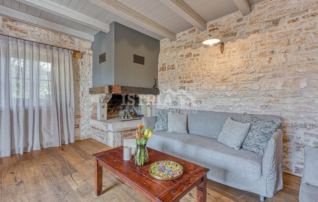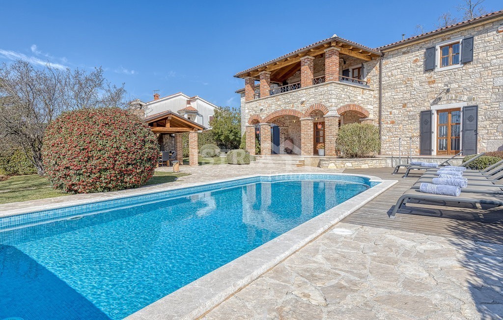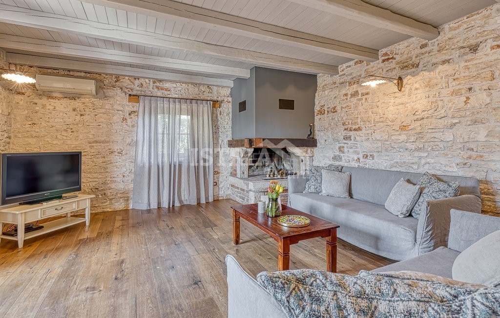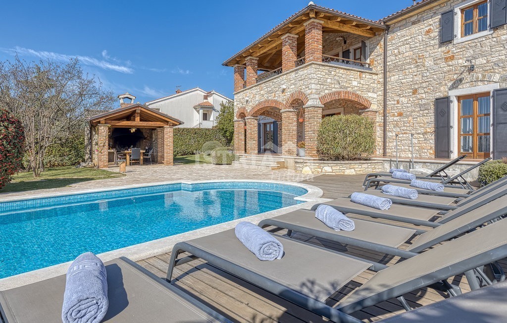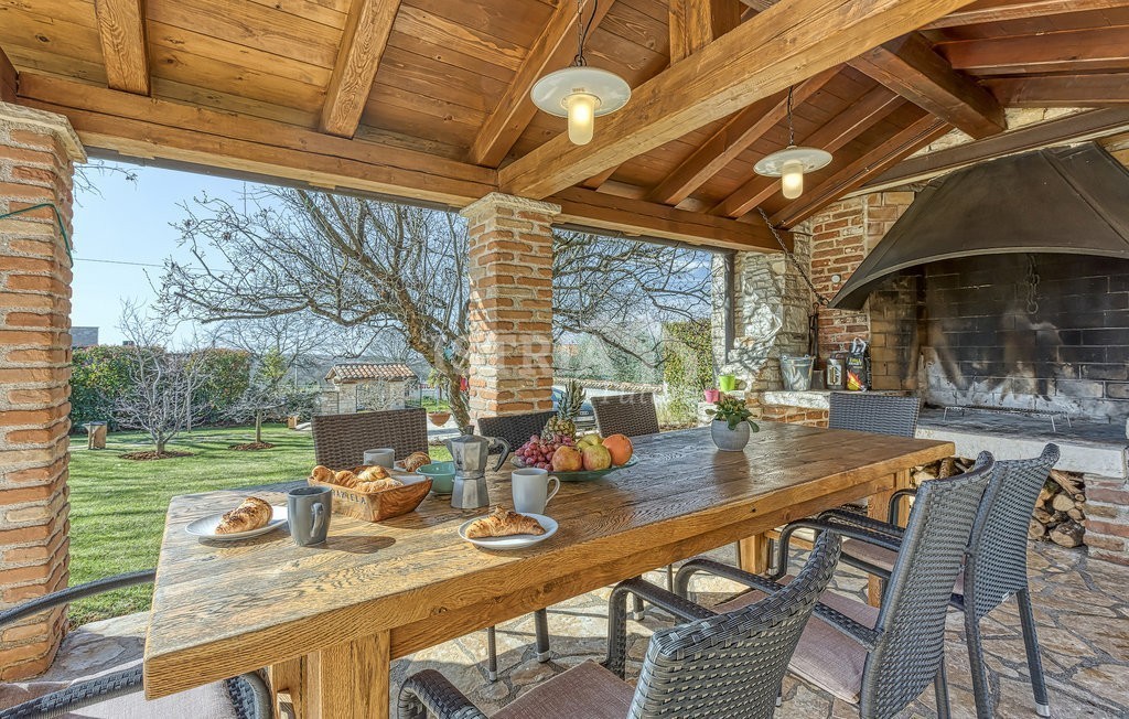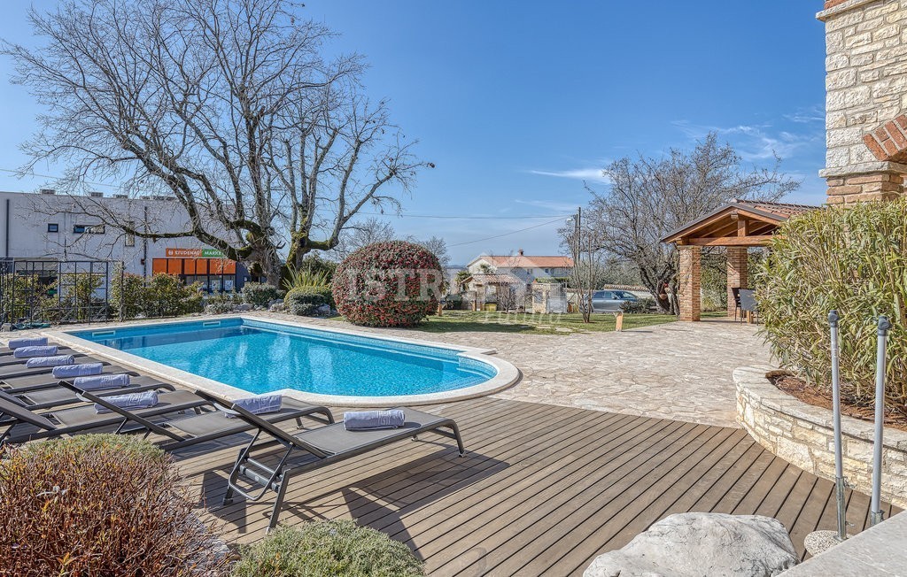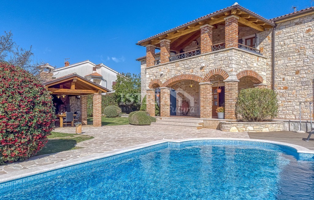 In vendita una splendida villa in pietra di 200 m² distribuiti tra piano terra e primo piano, situata su un terreno recintato e curato di 1.030 m², a 13 km dal centro di Parenzo e dal mare.