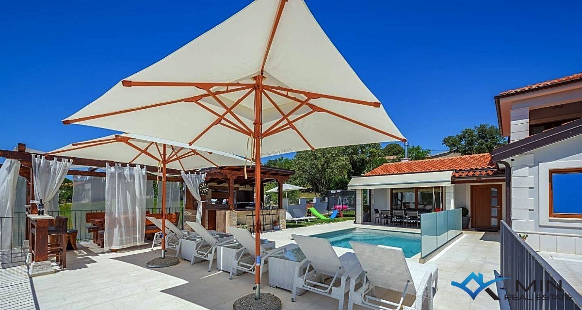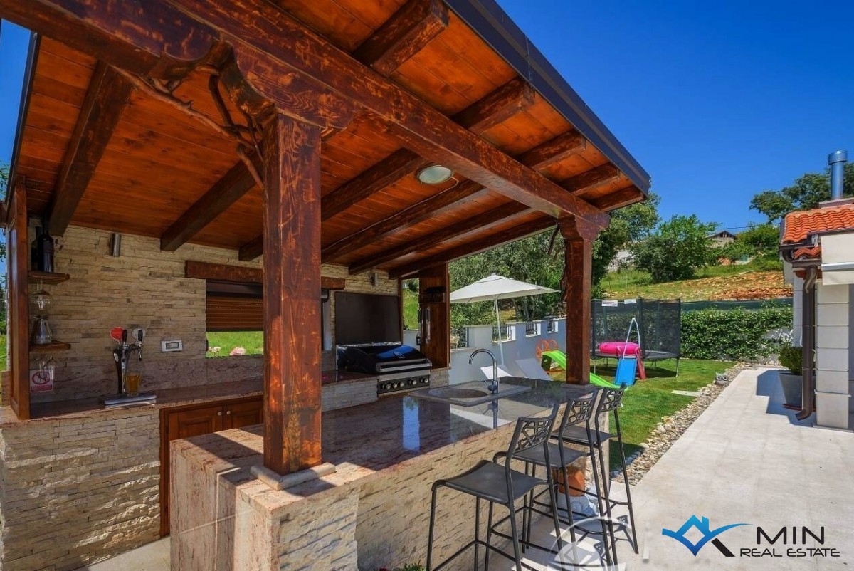 Una casa con piscina è in vendita, situata a 2 km dal centro di Verteneglio ea 7 km da Cittanova. La casa si trova in una posizione tranquilla e dispone di 203 m2. La casa è divisa in 2 piani ed è composta dal piano terra e dal 1° piano. Al piano terra si trova un comodo soggiorno, una cucina con sala da pranzo, 2 camere da letto, una lavanderia, 2 bagni e una stanza con vasca idromassaggio. Al primo piano si trova una camera da letto con accesso ad un terrazzo coperto, un guardaroba e un bagno. La casa ha un bellissimo giardino di 538 m2, dove c'è una piscina di 19 m2 e una cucina estiva coperta. La casa dispone di una taverna separata per socializzare con una camera da letto e bagno. Ogni stanza della casa è dotata di aria condizionata, e c'è il riscaldamento solare tramite una pompa dell'acqua elettrica e il riscaldamento centralizzato tramite un camino. La casa dispone di 3 posti auto coperti. La casa viene affittata per scopi turistici e ha un'ottima occupazione in pre-stagione, stagione e post-stagione. La distanza dal mare e dalla spiaggia splendidamente decorata è di 7 km