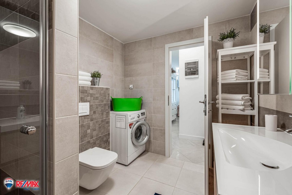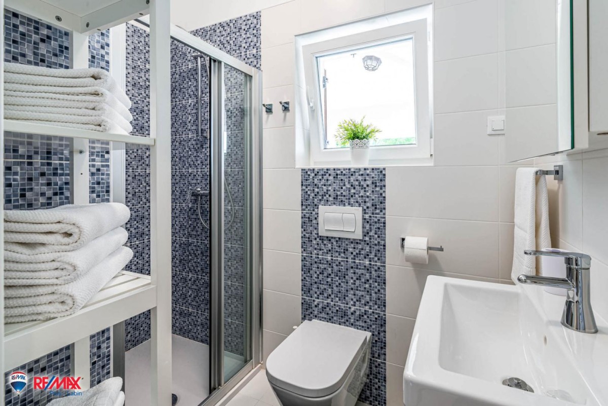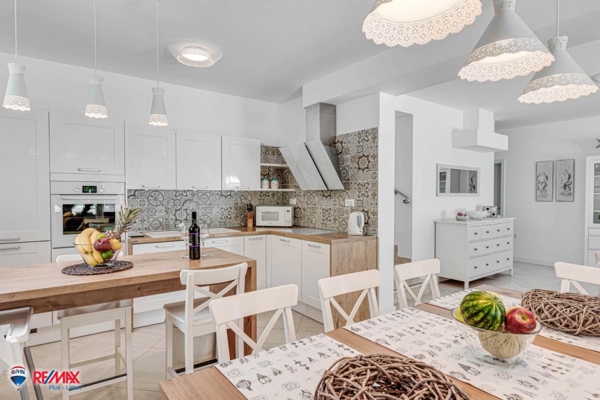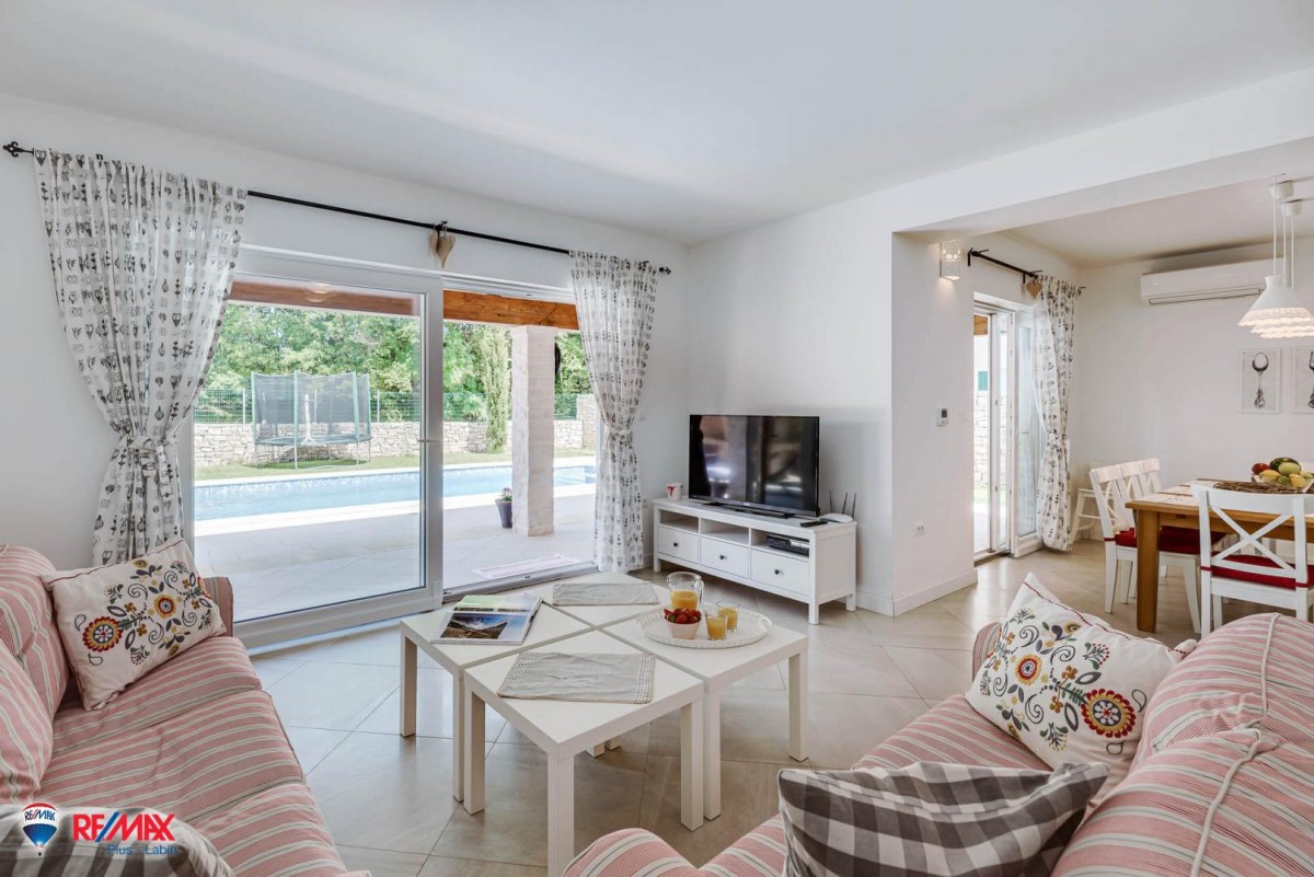 Due camere da letto hanno un letto matrimoniale e un bagno privato, la terza camera ha due letti singoli ed è disponibile anche un bagno separato. Al piano inferiore si trovano una camera da letto climatizzata con accesso diretto alla piscina, un bagno e un luminoso soggiorno con TV collegato alla sala da pranzo e ad una cucina completamente attrezzata.